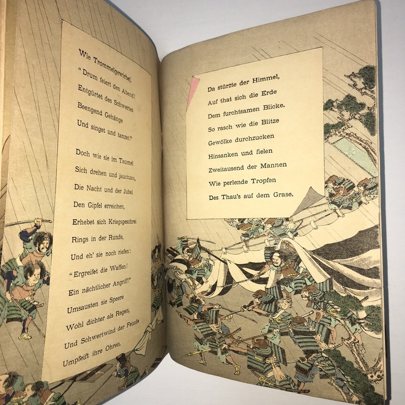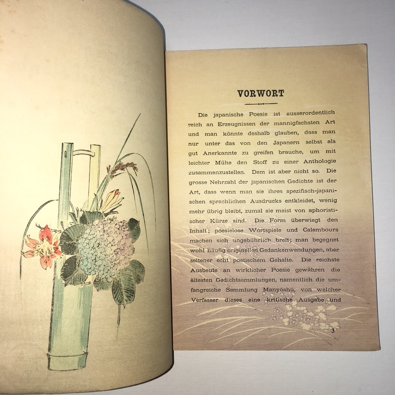 [Japan] by Karl Florenz. [Poetical Greetings of the Far East]. Although the crepe paper editions of this book were very popular and went through numerous editions, we believe there were very few printings of the plain paper edition in German on hosho paper. The Japanese colophon states '9th edition' but we believe this was just copied using a woodblock from the 9th edition of the crepe paper version. Presumably came in a slipcase but one is not present here. The photo with two books shows the hosho paper edition on the right and the crepe paper edition on the left. This listing is only for the hosho paper edition.