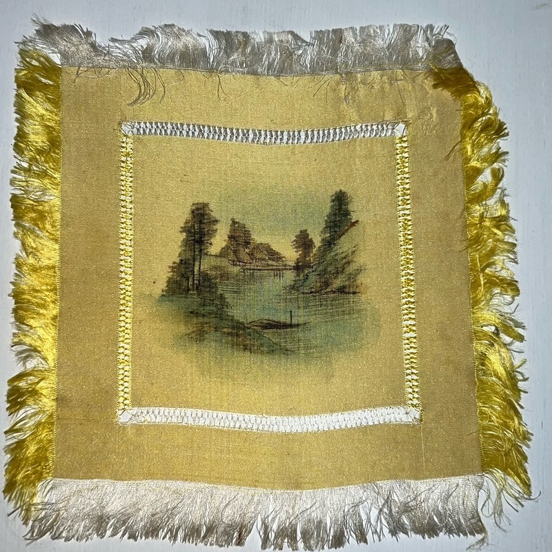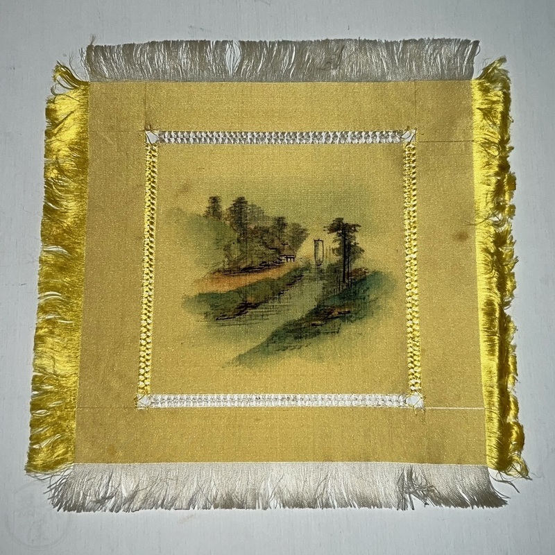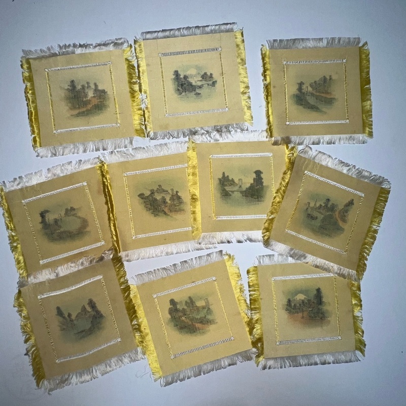 [Japan] Very scarce set of silk squares in their original box. Each square has a hand-painted illustration of a Japanese scenic view and the squares have silver threads at the top and bottom as well as gold threads on the left and right. Presumably a complete set of 10.