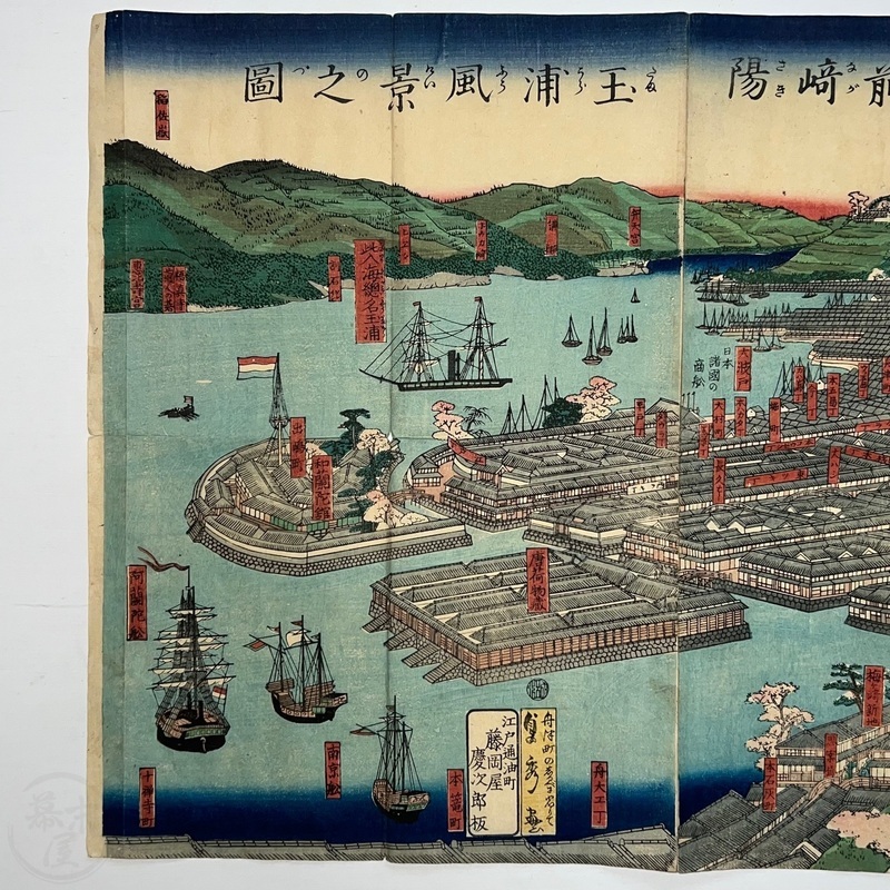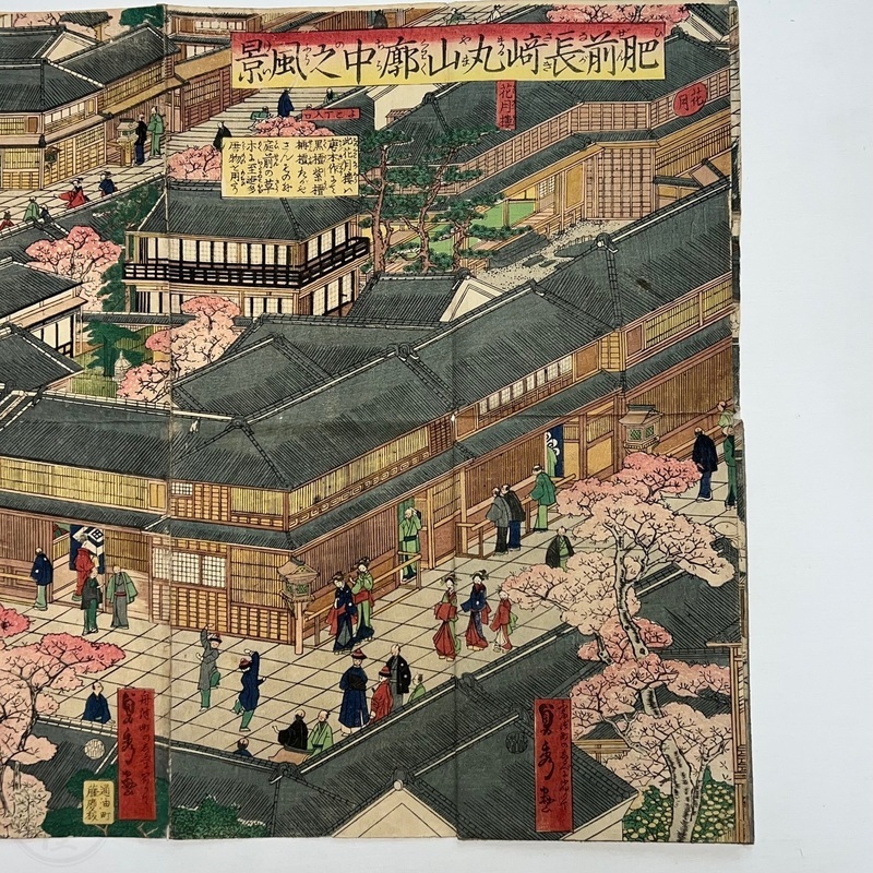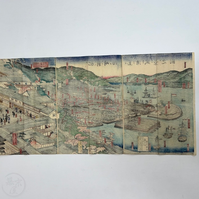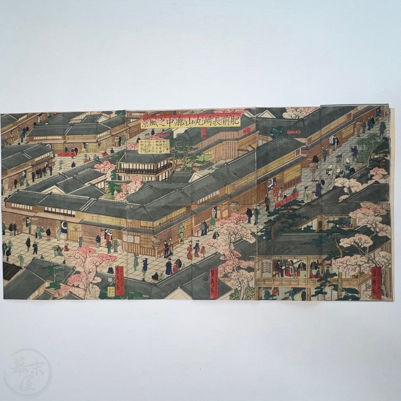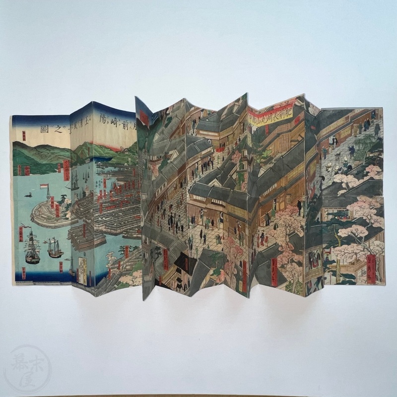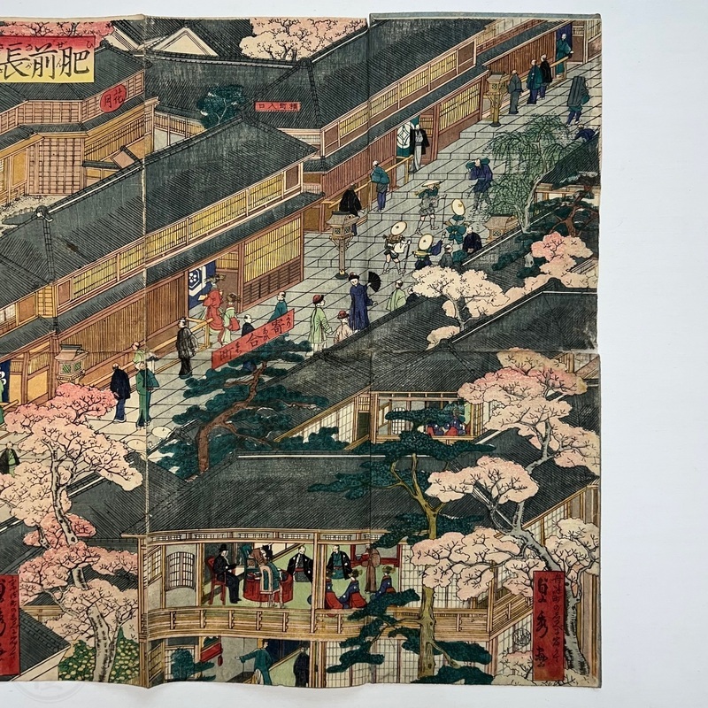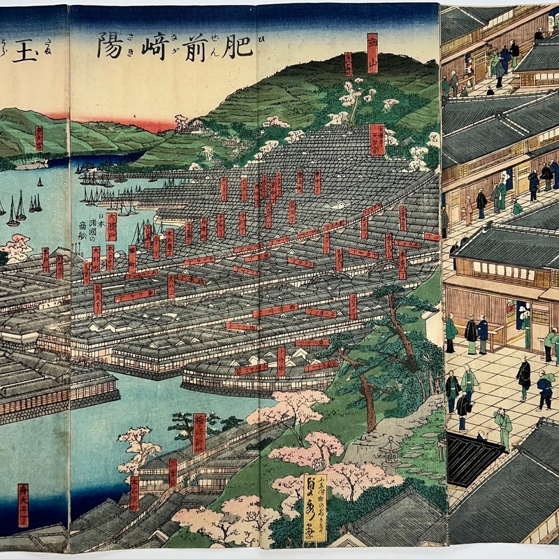 [Japan] Truly a superb piece of art by Sadahide (1807-c1879), who produced some of the most iconic maps prints and woodblock prints depicting the lives of Westerners in Yokohama and Nagasaki from 1859 when the two treaty ports were opened to the world. This work is actually two triptychs that were designed to be joined together to make a magnificent six-panel print. The first triptych (the three prints making up the right half of the hexaptych) is titled, 'Hizen Nagasaki Maruyama Kakuchu no Fukei' [View of the Maruyama Red Light Area in Nagasaki, Hizen Province'] and the second triptych (the three prints making up the left half of the hexaptych) is titled, 'Hizen Kiyo [Nagasaki] Tamaura Fukei no Zu' ['View of Tamaura in Nagasaki, Hizen Province']. From the far right panel we see the bustling Nagasaki town in spring with cherry blossoms in full bloom and Westerners, Japanese and some Chinese people going about their daily lives. Courtesans are walking in the street, a couple of Chinese dancers are performing, and a group of Westerners and Japanese are being entertained by geisha in a private room. The three prints making up the left half of the hexaptych show the port area with streets and areas named (such as Edo-cho, Hirado-cho etc.) and ends with a lovely view of Dejima and a Dutch vessel along with a few other ships anchored in port. Interestingly, this hexaptych is joined together but has been perfectly folded in order to fit its covers that are labelled 'Nagasaki Saiken Zuga' ['Detailed Map of Nagasaki']. The covers may have been used for an actual map but it is possible the first owner had the covers made for this when it was bought. A very impressive item.