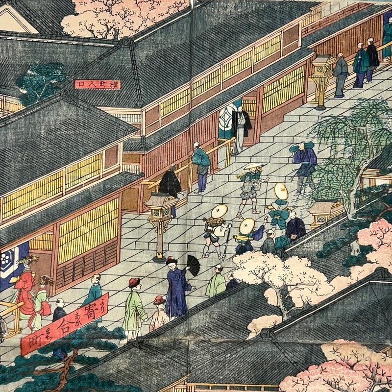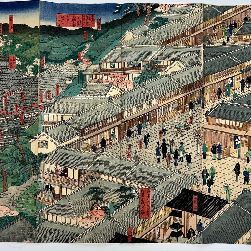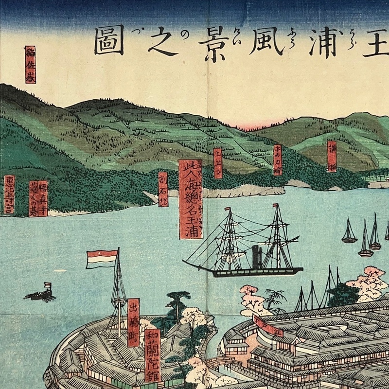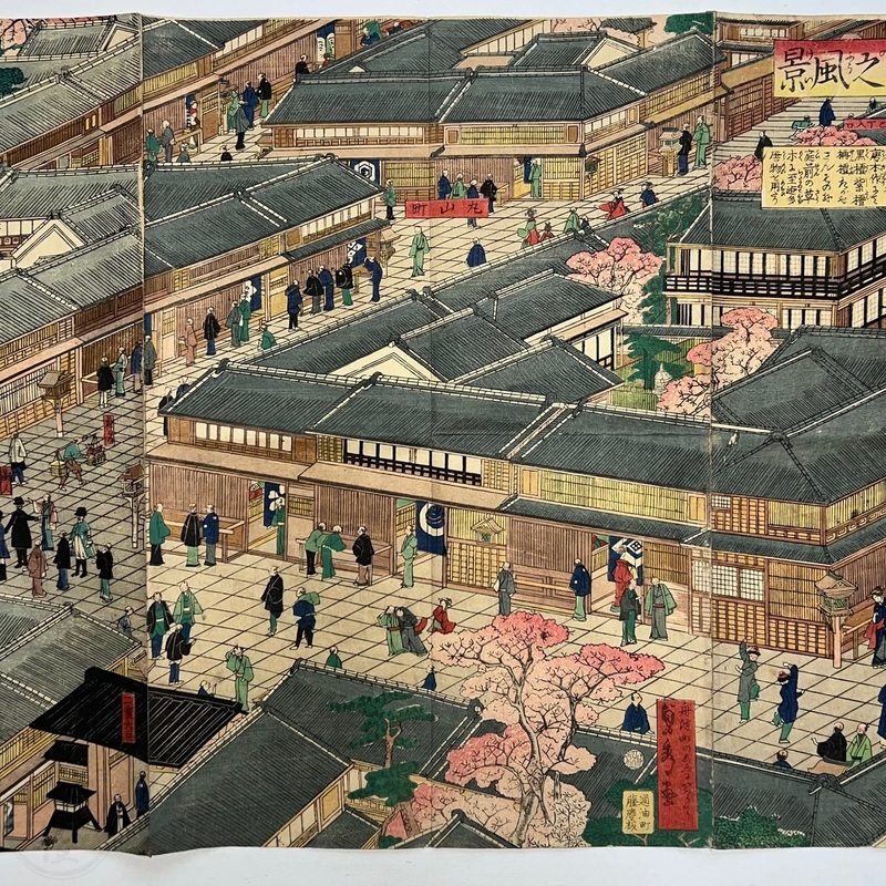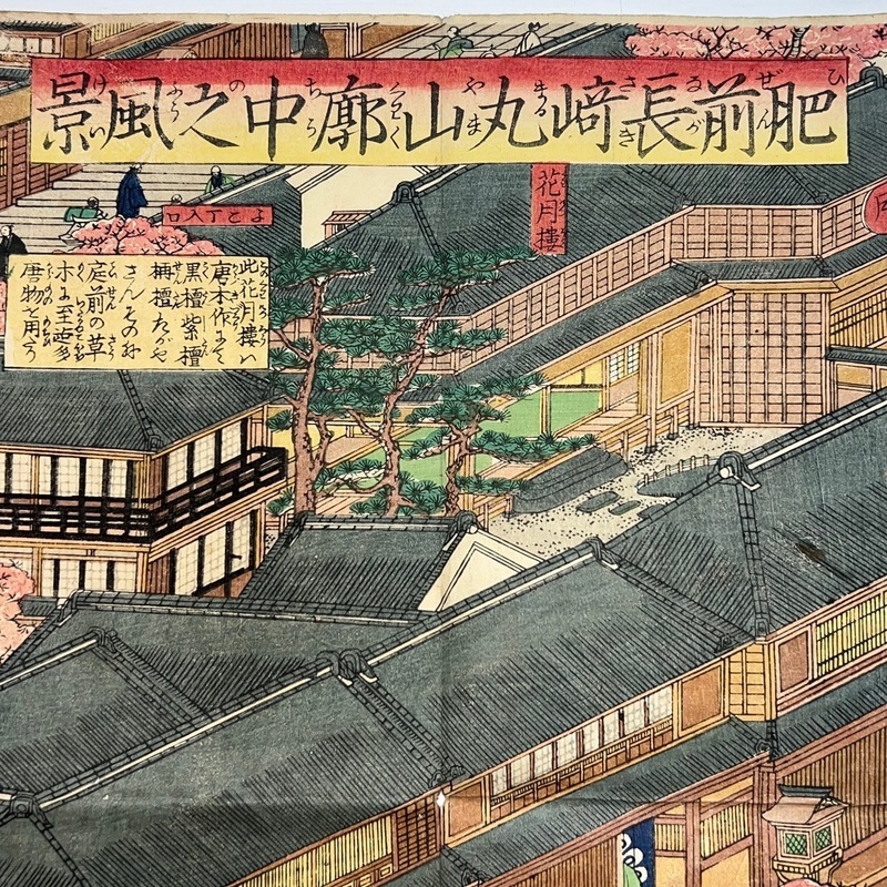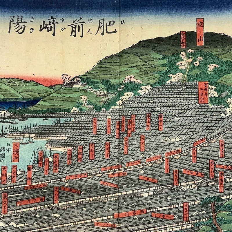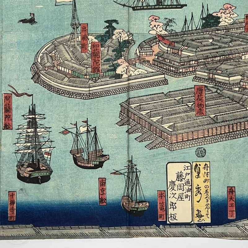 [Japan] Truly a superb piece of art by Sadahide (1807-c1879), who produced some of the most iconic maps prints and woodblock prints depicting the lives of Westerners in Yokohama and Nagasaki from 1859 when the two treaty ports were opened to the world. This work is actually two triptychs that were designed to be joined together to make a magnificent six-panel print. The first triptych (the three prints making up the right half of the hexaptych) is titled, 'Hizen Nagasaki Maruyama Kakuchu no Fukei' [View of the Maruyama Red Light Area in Nagasaki, Hizen Province'] and the second triptych (the three prints making up the left half of the hexaptych) is titled, 'Hizen Kiyo [Nagasaki] Tamaura Fukei no Zu' ['View of Tamaura in Nagasaki, Hizen Province']. From the far right panel we see the bustling Nagasaki town in spring with cherry blossoms in full bloom and Westerners, Japanese and some Chinese people going about their daily lives. Courtesans are walking in the street, a couple of Chinese dancers are performing, and a group of Westerners and Japanese are being entertained by geisha in a private room. The three prints making up the left half of the hexaptych show the port area with streets and areas named (such as Edo-cho, Hirado-cho etc.) and ends with a lovely view of Dejima and a Dutch vessel along with a few other ships anchored in port. Interestingly, this hexaptych is joined together but has been perfectly folded in order to fit its covers that are labelled 'Nagasaki Saiken Zuga' ['Detailed Map of Nagasaki']. The covers may have been used for an actual map but it is possible the first owner had the covers made for this when it was bought. A very impressive item.