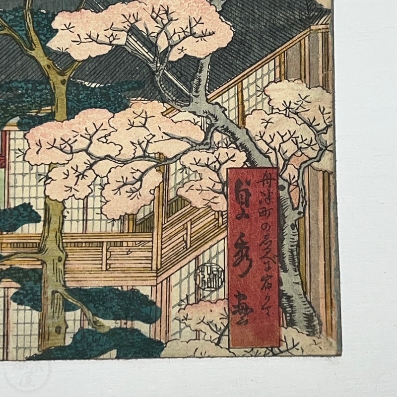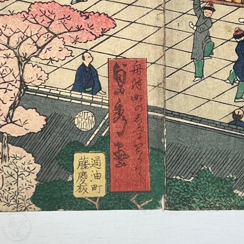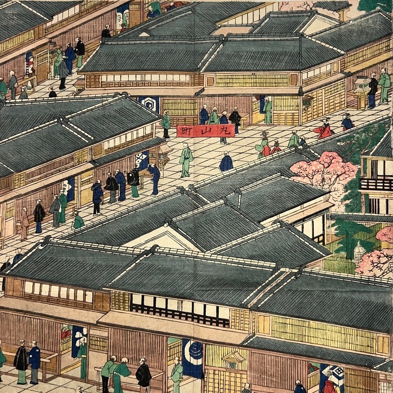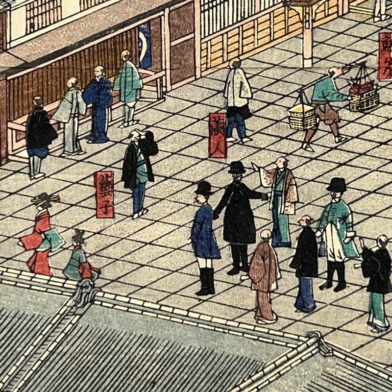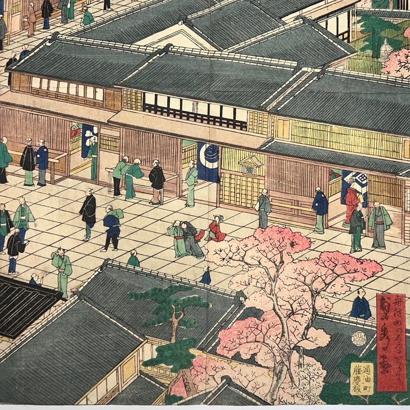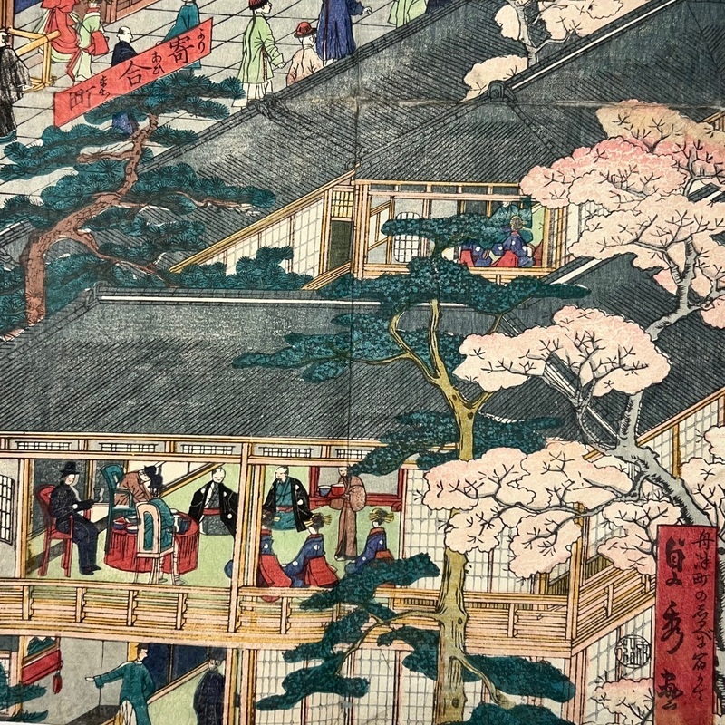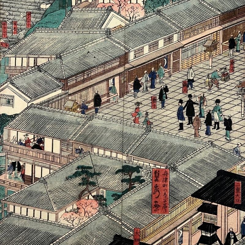 [Japan] Truly a superb piece of art by Sadahide (1807-c1879), who produced some of the most iconic maps prints and woodblock prints depicting the lives of Westerners in Yokohama and Nagasaki from 1859 when the two treaty ports were opened to the world. This work is actually two triptychs that were designed to be joined together to make a magnificent six-panel print. The first triptych (the three prints making up the right half of the hexaptych) is titled, 'Hizen Nagasaki Maruyama Kakuchu no Fukei' [View of the Maruyama Red Light Area in Nagasaki, Hizen Province'] and the second triptych (the three prints making up the left half of the hexaptych) is titled, 'Hizen Kiyo [Nagasaki] Tamaura Fukei no Zu' ['View of Tamaura in Nagasaki, Hizen Province']. From the far right panel we see the bustling Nagasaki town in spring with cherry blossoms in full bloom and Westerners, Japanese and some Chinese people going about their daily lives. Courtesans are walking in the street, a couple of Chinese dancers are performing, and a group of Westerners and Japanese are being entertained by geisha in a private room. The three prints making up the left half of the hexaptych show the port area with streets and areas named (such as Edo-cho, Hirado-cho etc.) and ends with a lovely view of Dejima and a Dutch vessel along with a few other ships anchored in port. Interestingly, this hexaptych is joined together but has been perfectly folded in order to fit its covers that are labelled 'Nagasaki Saiken Zuga' ['Detailed Map of Nagasaki']. The covers may have been used for an actual map but it is possible the first owner had the covers made for this when it was bought. A very impressive item.