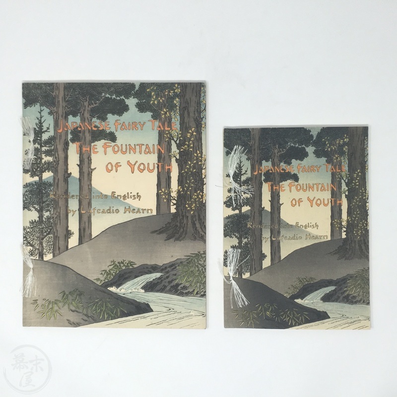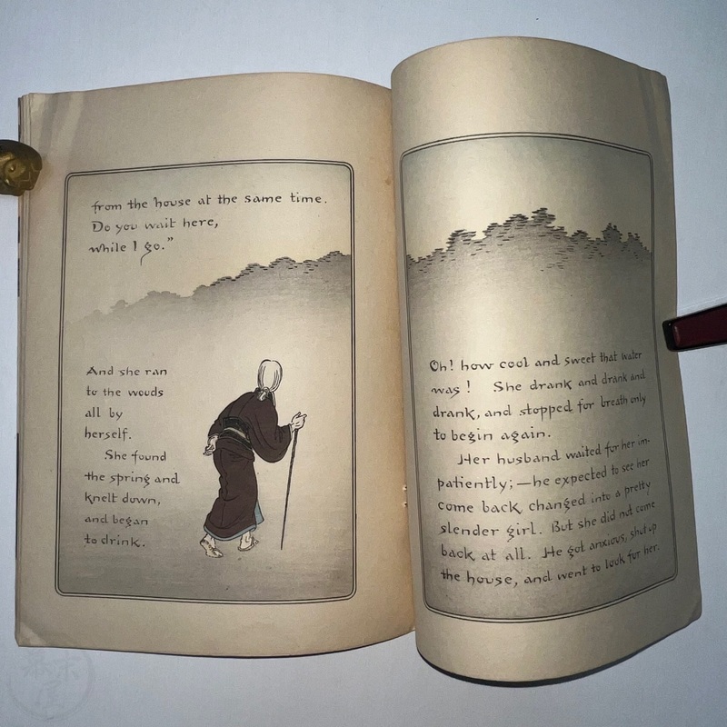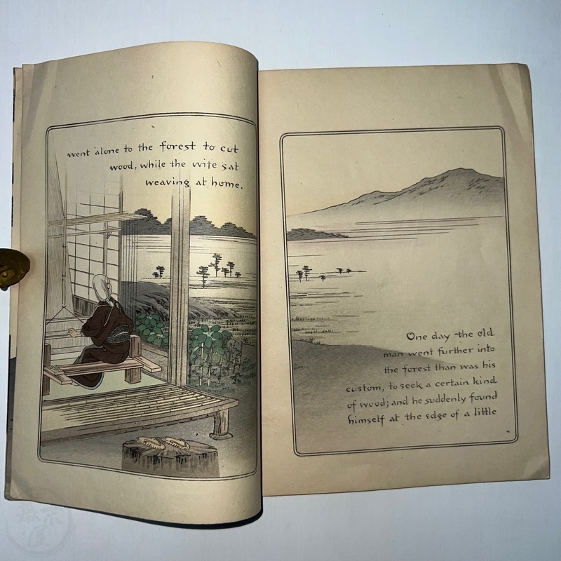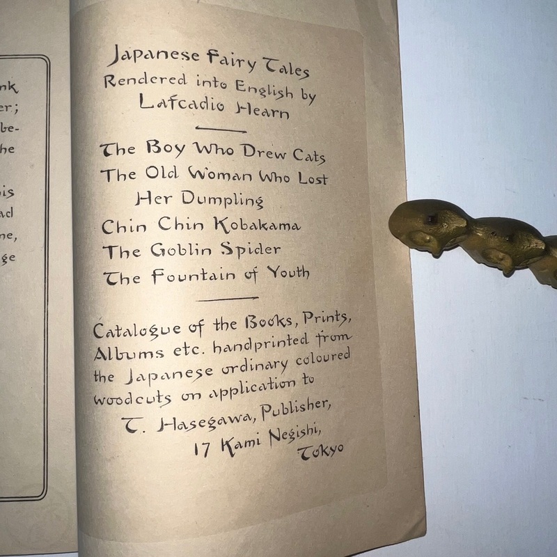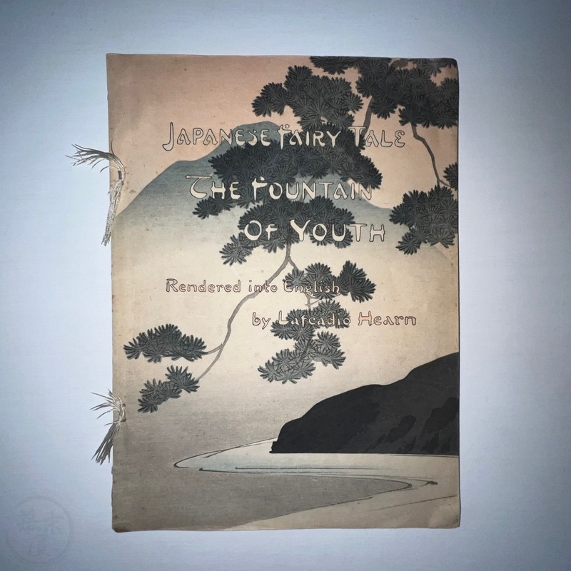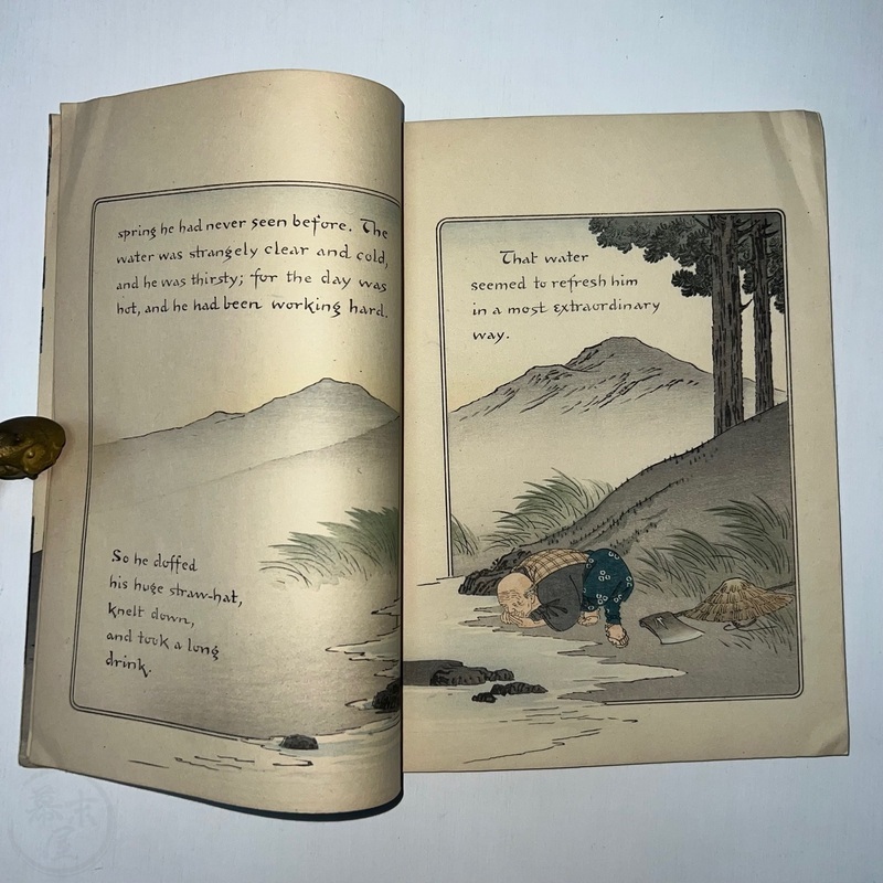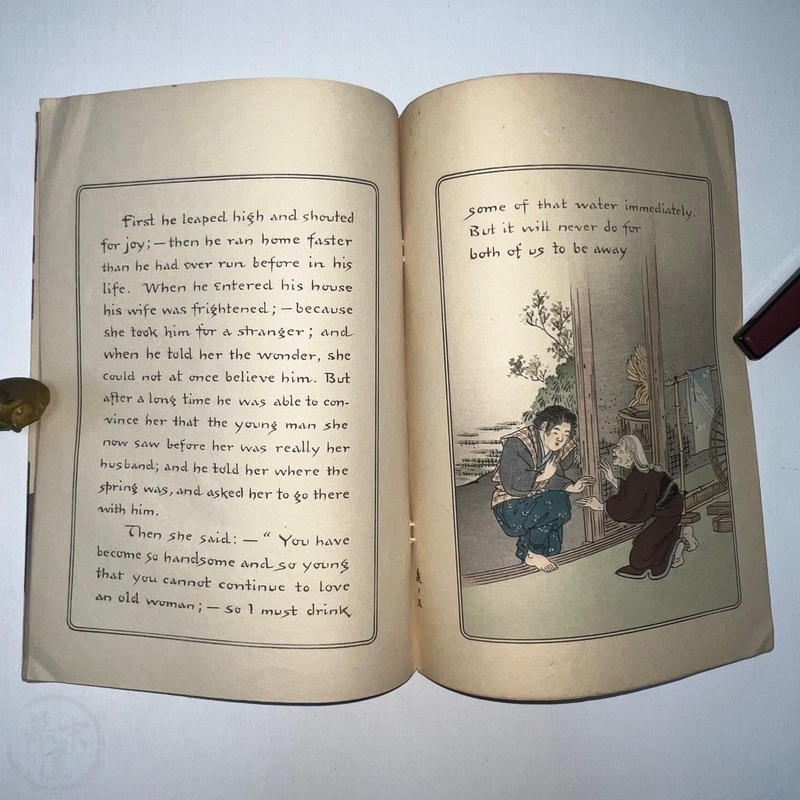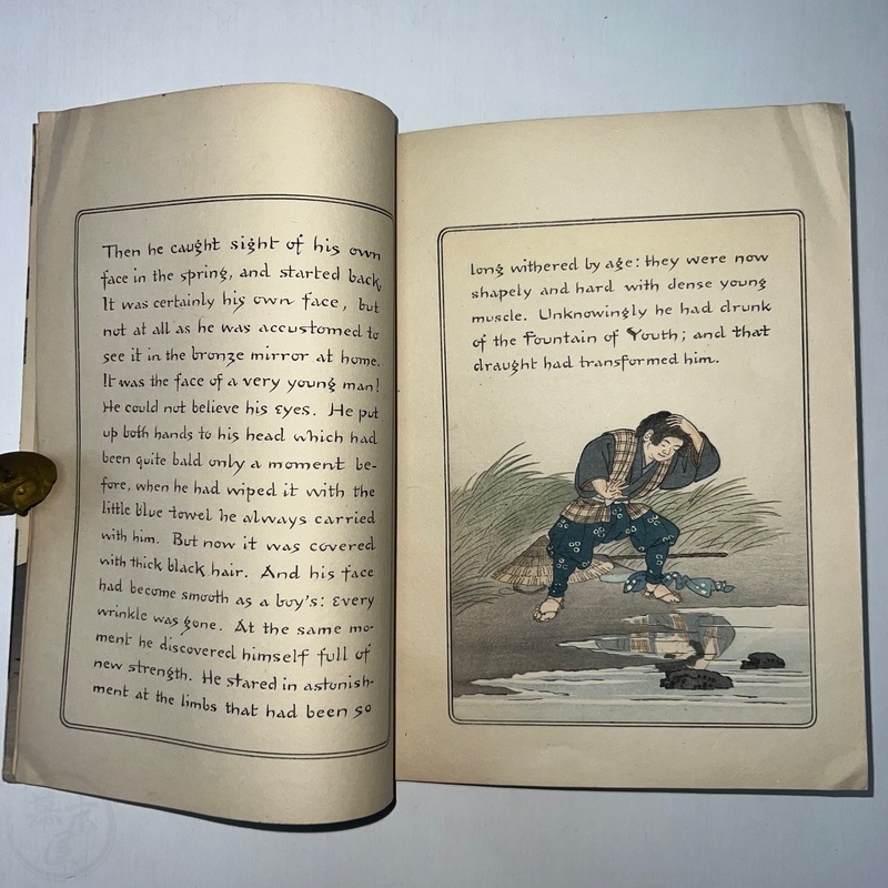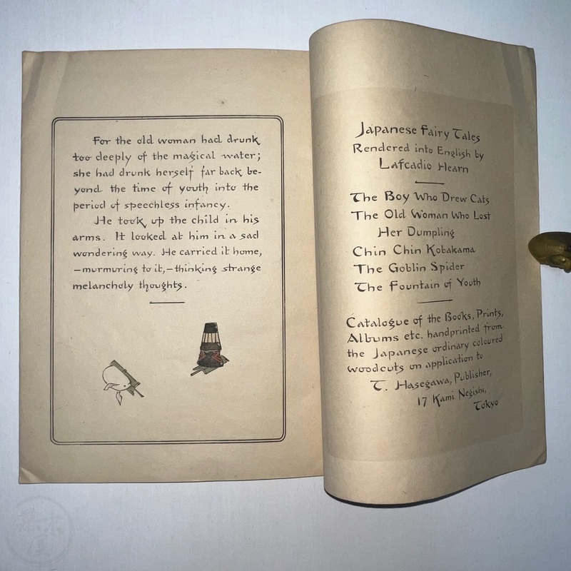 長谷川日本昔話の世界において重要な発見です。ラフカディオ・ハーンによって英訳されたこの『若返りの泉』は、これまで知られていた版とは全く異なる表紙をしています(比較のために最後の写真をご覧ください)。その他のページは既知の版と同じように見えます。長谷川/西宮が、クレープ紙で出版された5冊組本の一部であるこの本に、なぜ新しい表紙を制作したのかは謎です。これまで発見されたものの中で最も希少なものと言えるでしょう。