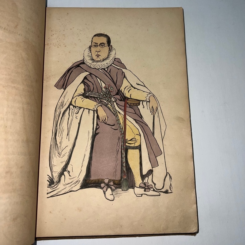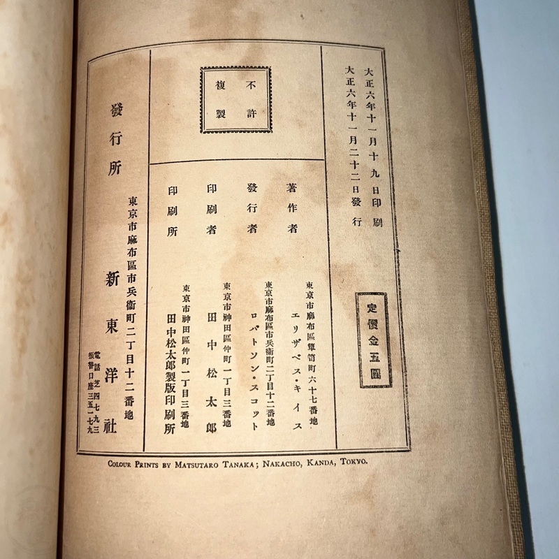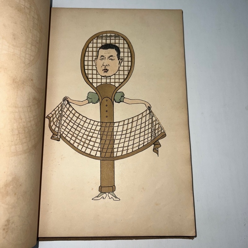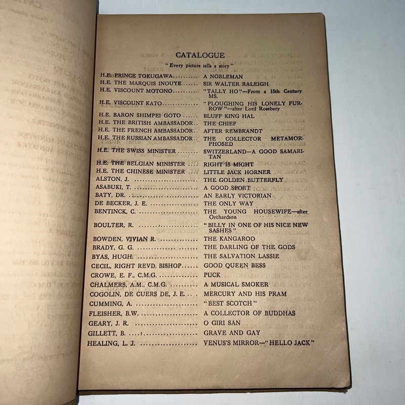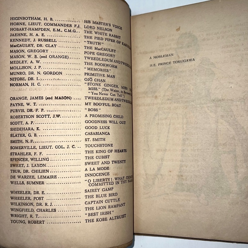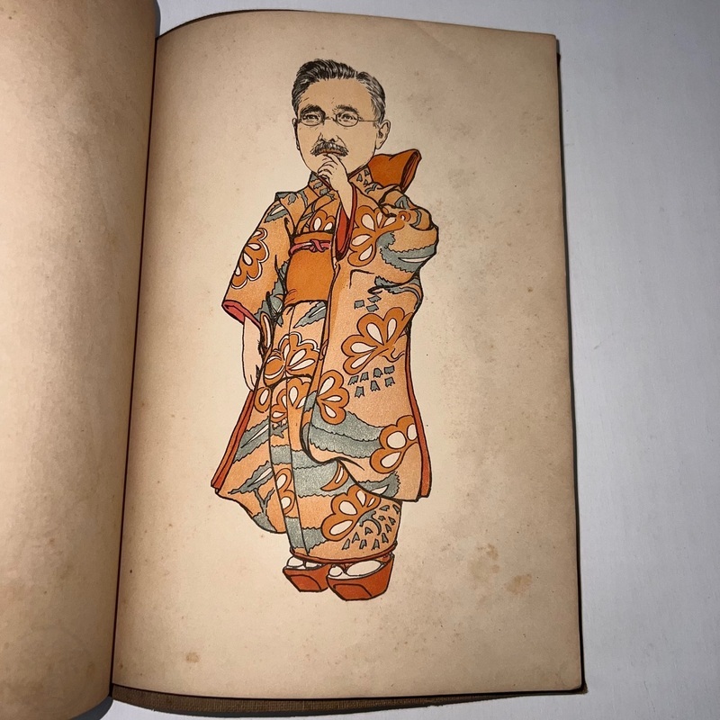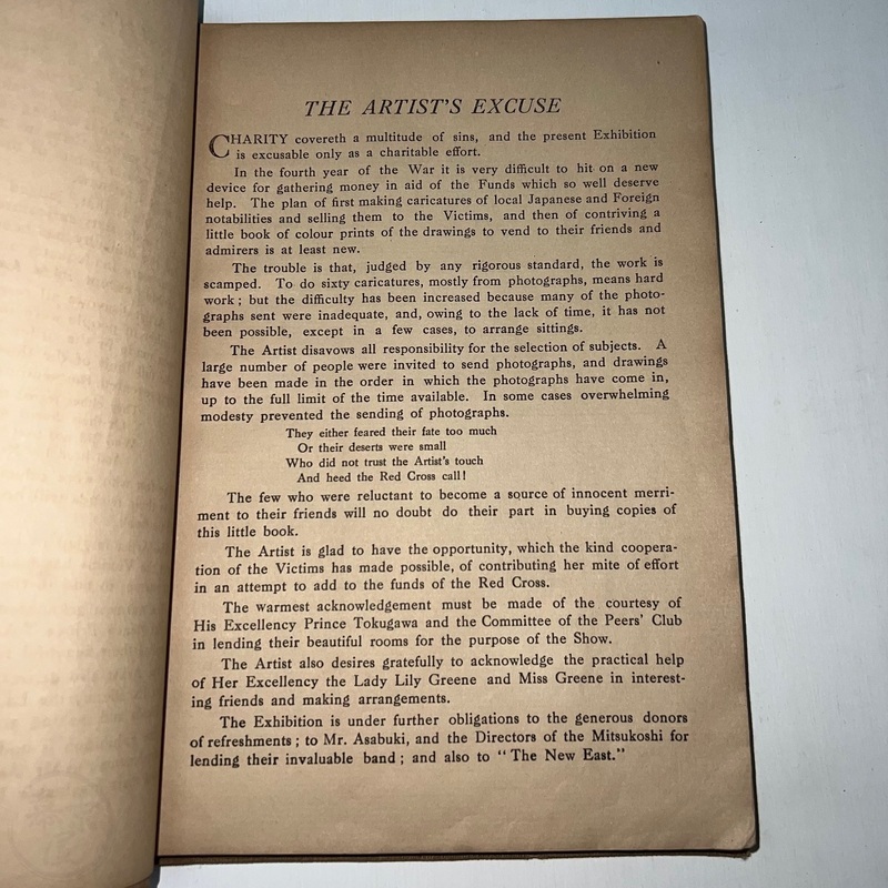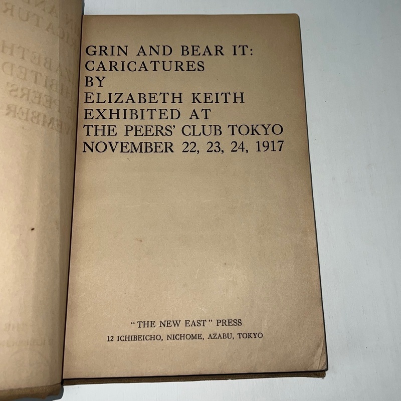 エリザベス・キース(1887-1956)は1915年から約9年間日本に住み、韓国にも滞在した。第一次世界大戦で負傷した兵士のための資金集めのために出版され、価格は5円だった。外交官を含む西洋人を中心に、徳川家達、井上馨、後藤新平、新渡戸稲造などの日本人の風刺画が63点(62丁)掲載されている。西洋人としては、トーマス・バティ博士、J.E.デ・ベッカー、ビビアン・ボーデン、ヒュー・バイヤス、クレイ・マコーリー博士、W.B.メイソン、ジェームズ・ペンダー・モリソン、N.ゴードン・マンロー博士、エドウィン・ホイーラー博士、ロバート・ヤングなどが有名である。表紙にオリジナルの木版画。本はニュー・イースト・プレスを経営していたキースの義兄、J.W.ロバートソン・スコットによって出版された。