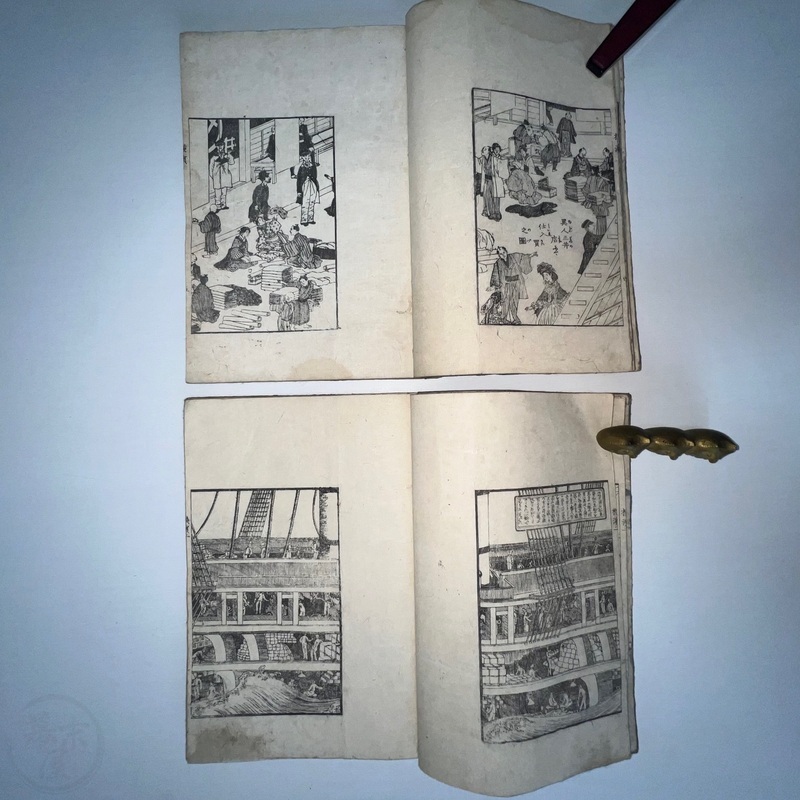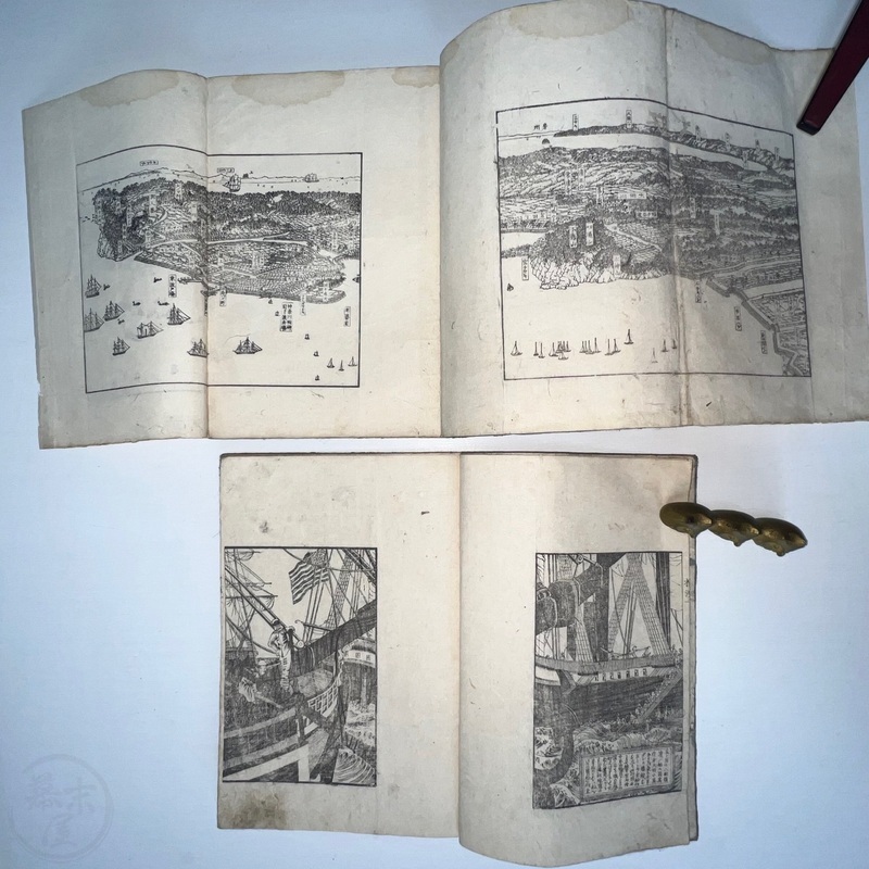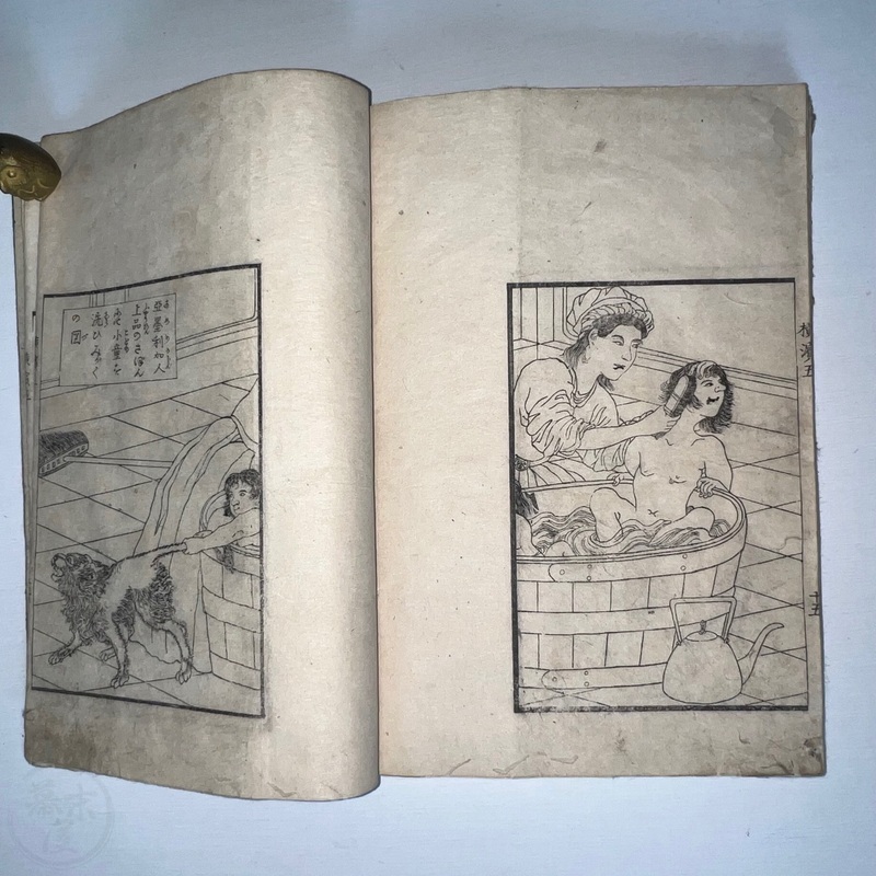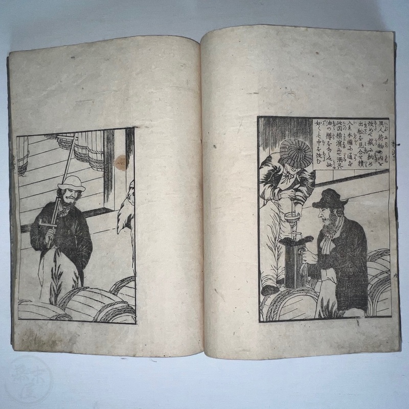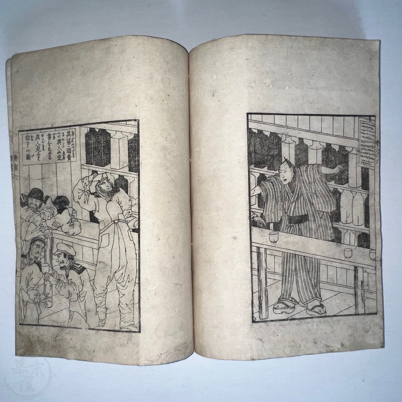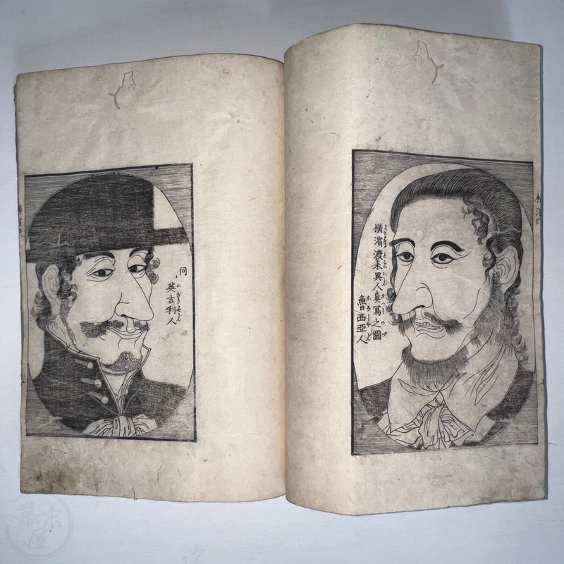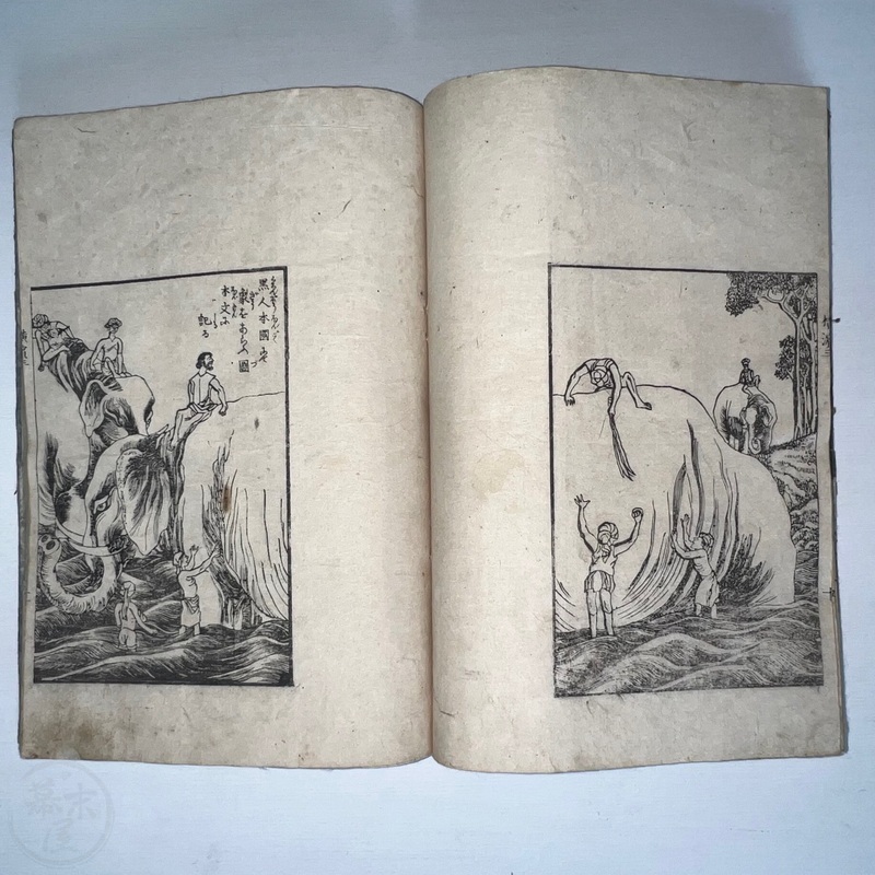 [Japan] One of the most important works depicting the life of Western residents of Yokohama soon after the port was opened in July 1859, this is a complete set of 6 volumes of Sadahide's wonderful work showing the various things seen and heard around Yokohama at the time. Each volume is filled with superb woodblock printed illustrations and it is fascinating to see how foreigners looked and behaved in Japanese eyes. The first 3 volumes were published in 1862 (the date of the preface) and the second 3 volumes came out in 1865 (according to the preface date in the final volume). The first volume begins with a large, folding map of Yokohama and the surrounding area and then foreigners going about their lives doing business and shopping. Some stores are even named such as the clothing shop, Fukuiya and a tea house named Iseya. Brief descriptions of each scene are given. A foreign couple gallops down the street on a horse and there are contemporary reports about such reckless behaviour that caused injuries and even death on occasion. Western children and drunk sailors can be seen, as well as the French barracks, the Ishikawa silk store, a grog shop, and more. Most of the activity was on the main streets of Honcho-dori and Kaigan-dori. Volume 2 starts with some impressive illustrations of Western ships inside and out, a procession of the five treaty powers (the US, England, France, The Netherlands, and Prussia. Interestingly, some women are in the procession so this was probably an attempt to show that these early residents were not afraid to go out at a time when there had been some murders of foreigners by disgruntled Japanese who were still against the idea of Japan opening up. A woman can be seen riding a horse and that was also unheard of in Japan prior to the country's forced opening to the world. Next we see a French merchant's establishment at No. 10, warehouses, a wonderful image of Westerners playing billiards, men of African origin lugging water barrels and presumably tending to goats that can be seen in the background, a gorgeous lunch party held on the second floor in a decorated room, food preparation, and a group of foreigners dancing in a circle. Volume 3 starts with illustrations of shipbuilding, an image of the gate to the Dutch minister's residence (presumably Dirk de Graeff von Polsbroek), some Chinese people relaxing, a woman and baby, the residence of Eugene Van Reed along with an illustration of him on a horse, men putting alcohol (presumably rum or whisky) or oil into casks for shipment, elephants being washed by handlers, Western children playing, black men and women, American women, a camera and a music box, Western women sewing, Chinese men aat a party with geisha, and a famous image of a photographer at work but a dog is looking into the lens from the other side. The 4th volume (Volume 1 of the second trio) begins with Western soldiers partaking in drills and marching, Westerners in a horse and carriage, Western children playing, the same kids falling soon after (!), children reading and studying, portraits of a Russian man, an English man, a Dutch man, an American man, and a French man. These are followed by a couple of portraits of Western women in ornate dresses and hats, a butcher's establishment with cows present, the meat being cut, the meat being boiled, and the hides being dried. Volume 5 shows a group of Americans fishing, fish being dried on the shore, fish being transported by donkey or horse, dogs and children playing, Americans whaling, a laege tiger being hunted, a walrus being hunted, Western women preparing some kind of beans, an American lady using two mirrors to check her hairstyle from behind, a Western lady in a 3-wheeled carriage that appears to not require a horse, a Western man and a lion seemingly wrestling, another man about to shoot the lion, a man riding a camel, and Western children being washed in a bathtub. The final volume (dated 1865 in the preface) starts with illustrations of London, the Dutch minister's residence in Yokohama, English men playing a game on a table, Americans playing music on one of their holidays with Japanese people looking on, a Chinese lady in the Chinese area of Yokohama, Dutch men drinking and partying with a group of Japanese people, Dutch men at a sake shop with the Japanese attendant looking annoyed, a bird's-eye view of the Dutch minister's residence, illustrations of copperplate prints of foreigners that were seen in Yokohama, an elephant pushing over a tree with its trunk, a small group of foreigners (one lady being carried on a palanquin) returning from a hike in the hills, and an image of a copperplate illustration that shows a lady riding an elephant.