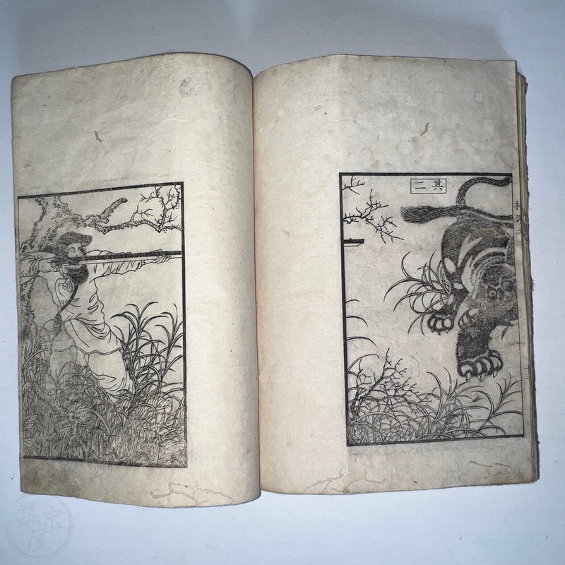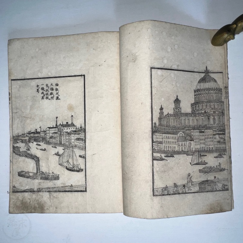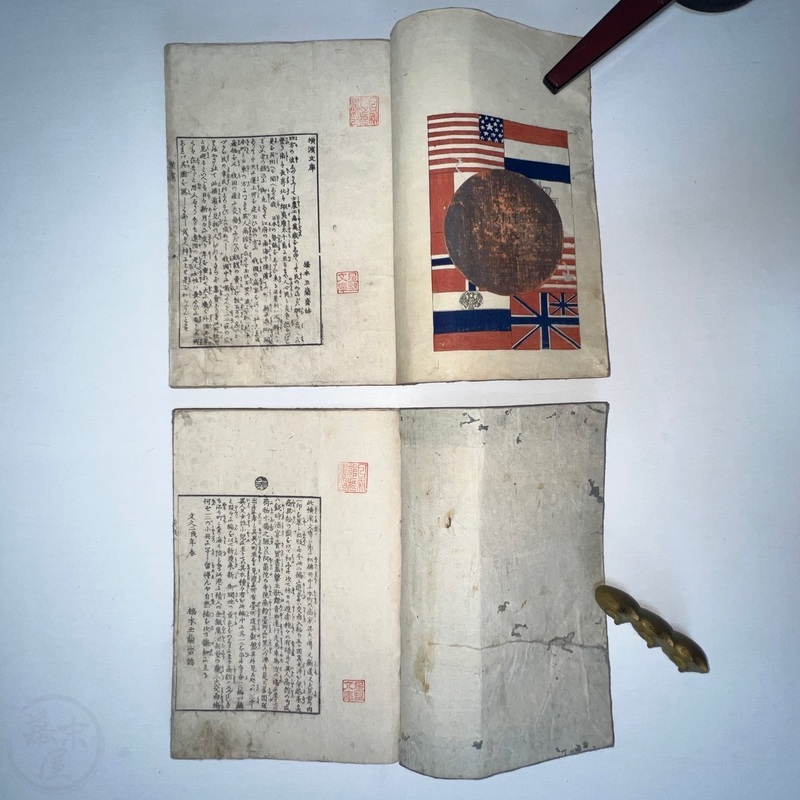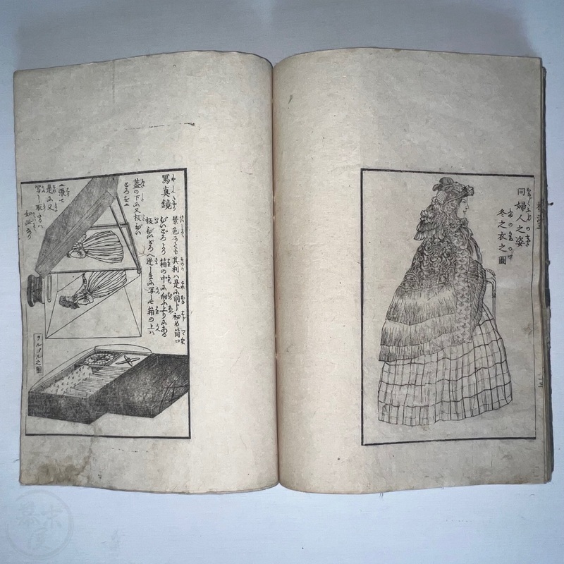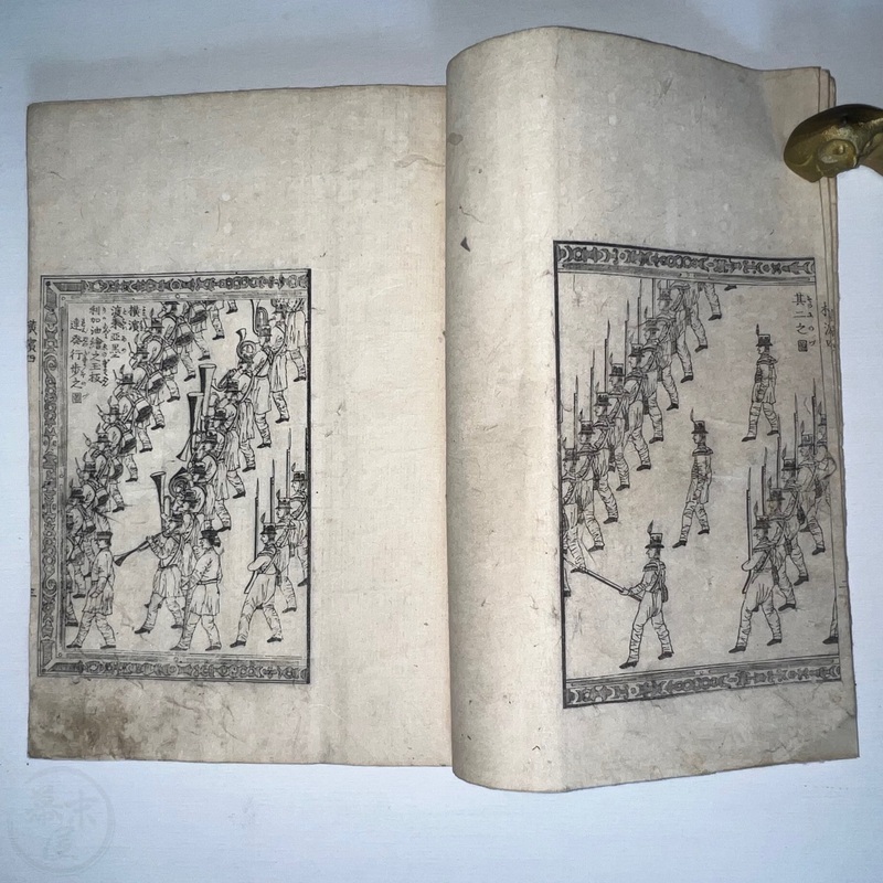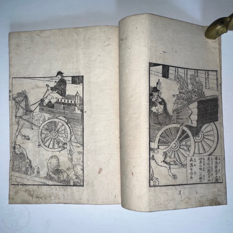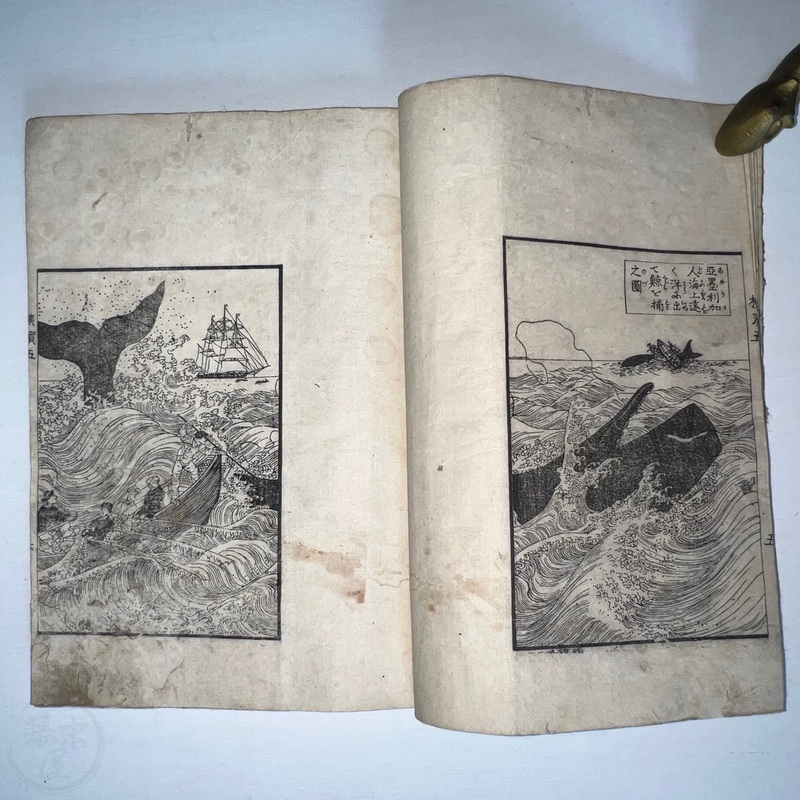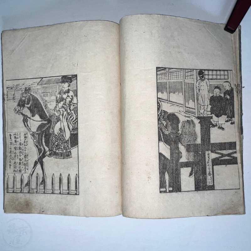 [Japan] One of the most important works depicting the life of Western residents of Yokohama soon after the port was opened in July 1859, this is a complete set of 6 volumes of Sadahide's wonderful work showing the various things seen and heard around Yokohama at the time. Each volume is filled with superb woodblock printed illustrations and it is fascinating to see how foreigners looked and behaved in Japanese eyes. The first 3 volumes were published in 1862 (the date of the preface) and the second 3 volumes came out in 1865 (according to the preface date in the final volume). The first volume begins with a large, folding map of Yokohama and the surrounding area and then foreigners going about their lives doing business and shopping. Some stores are even named such as the clothing shop, Fukuiya and a tea house named Iseya. Brief descriptions of each scene are given. A foreign couple gallops down the street on a horse and there are contemporary reports about such reckless behaviour that caused injuries and even death on occasion. Western children and drunk sailors can be seen, as well as the French barracks, the Ishikawa silk store, a grog shop, and more. Most of the activity was on the main streets of Honcho-dori and Kaigan-dori. Volume 2 starts with some impressive illustrations of Western ships inside and out, a procession of the five treaty powers (the US, England, France, The Netherlands, and Prussia. Interestingly, some women are in the procession so this was probably an attempt to show that these early residents were not afraid to go out at a time when there had been some murders of foreigners by disgruntled Japanese who were still against the idea of Japan opening up. A woman can be seen riding a horse and that was also unheard of in Japan prior to the country's forced opening to the world. Next we see a French merchant's establishment at No. 10, warehouses, a wonderful image of Westerners playing billiards, men of African origin lugging water barrels and presumably tending to goats that can be seen in the background, a gorgeous lunch party held on the second floor in a decorated room, food preparation, and a group of foreigners dancing in a circle. Volume 3 starts with illustrations of shipbuilding, an image of the gate to the Dutch minister's residence (presumably Dirk de Graeff von Polsbroek), some Chinese people relaxing, a woman and baby, the residence of Eugene Van Reed along with an illustration of him on a horse, men putting alcohol (presumably rum or whisky) or oil into casks for shipment, elephants being washed by handlers, Western children playing, black men and women, American women, a camera and a music box, Western women sewing, Chinese men aat a party with geisha, and a famous image of a photographer at work but a dog is looking into the lens from the other side. The 4th volume (Volume 1 of the second trio) begins with Western soldiers partaking in drills and marching, Westerners in a horse and carriage, Western children playing, the same kids falling soon after (!), children reading and studying, portraits of a Russian man, an English man, a Dutch man, an American man, and a French man. These are followed by a couple of portraits of Western women in ornate dresses and hats, a butcher's establishment with cows present, the meat being cut, the meat being boiled, and the hides being dried. Volume 5 shows a group of Americans fishing, fish being dried on the shore, fish being transported by donkey or horse, dogs and children playing, Americans whaling, a laege tiger being hunted, a walrus being hunted, Western women preparing some kind of beans, an American lady using two mirrors to check her hairstyle from behind, a Western lady in a 3-wheeled carriage that appears to not require a horse, a Western man and a lion seemingly wrestling, another man about to shoot the lion, a man riding a camel, and Western children being washed in a bathtub. The final volume (dated 1865 in the preface) starts with illustrations of London, the Dutch minister's residence in Yokohama, English men playing a game on a table, Americans playing music on one of their holidays with Japanese people looking on, a Chinese lady in the Chinese area of Yokohama, Dutch men drinking and partying with a group of Japanese people, Dutch men at a sake shop with the Japanese attendant looking annoyed, a bird's-eye view of the Dutch minister's residence, illustrations of copperplate prints of foreigners that were seen in Yokohama, an elephant pushing over a tree with its trunk, a small group of foreigners (one lady being carried on a palanquin) returning from a hike in the hills, and an image of a copperplate illustration that shows a lady riding an elephant.