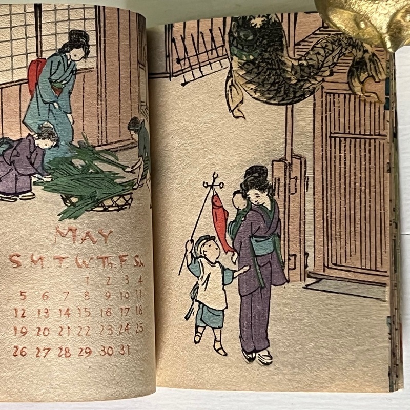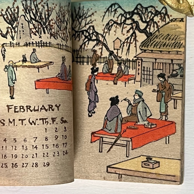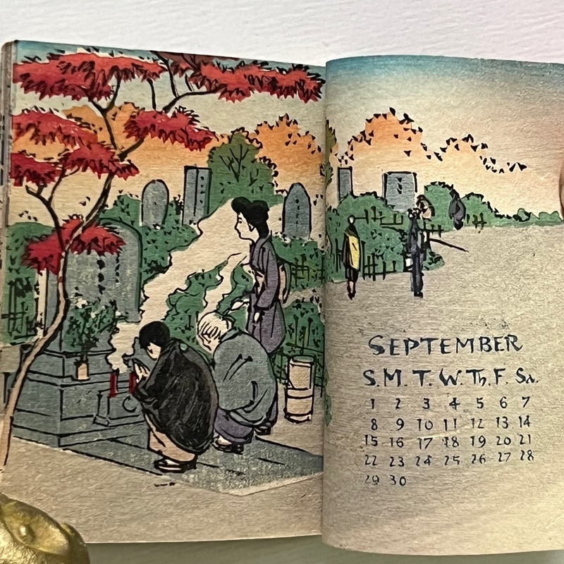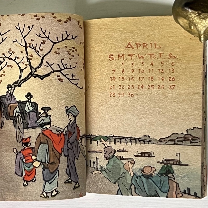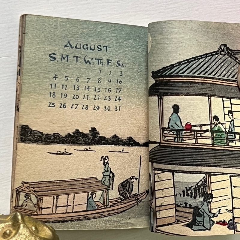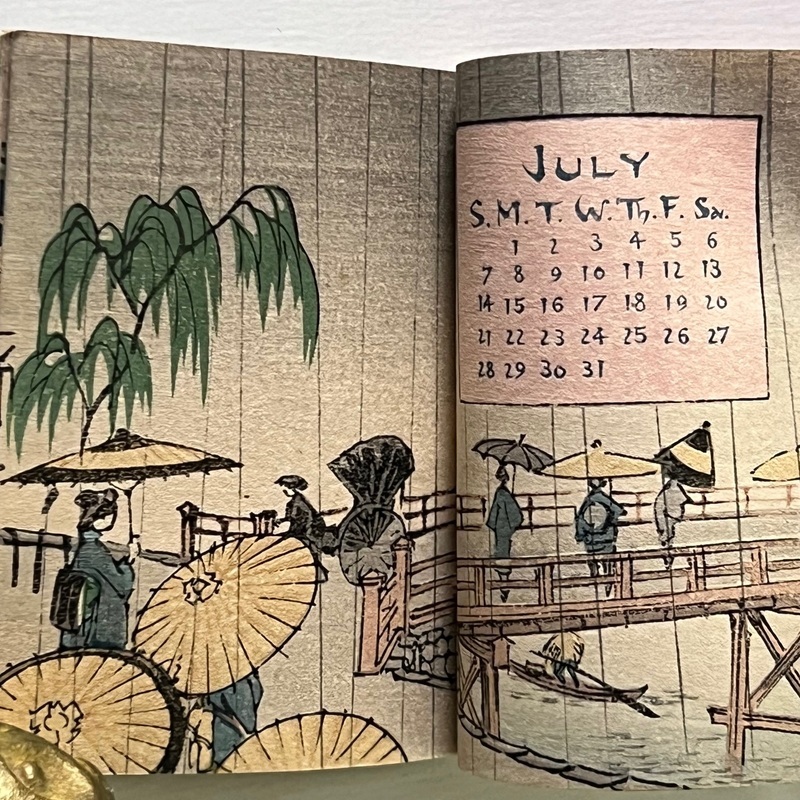 [Japan] Uncommon, lovely little woodblock printed calendar on plain paper by Hasegawa.