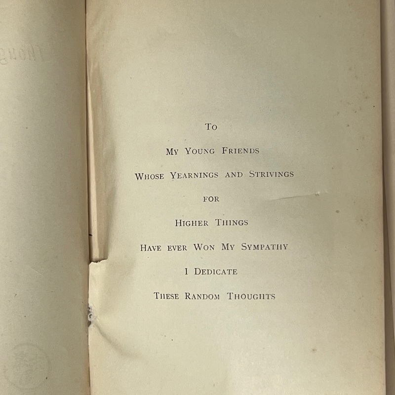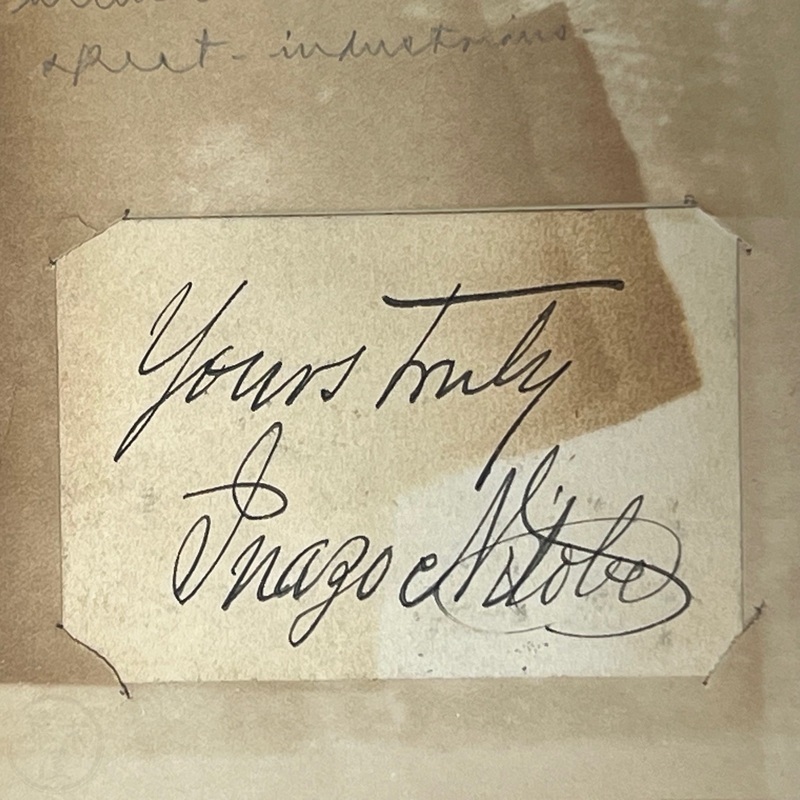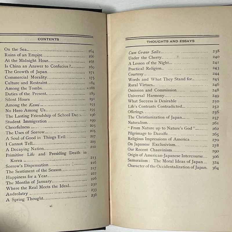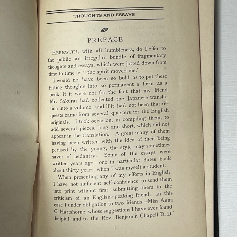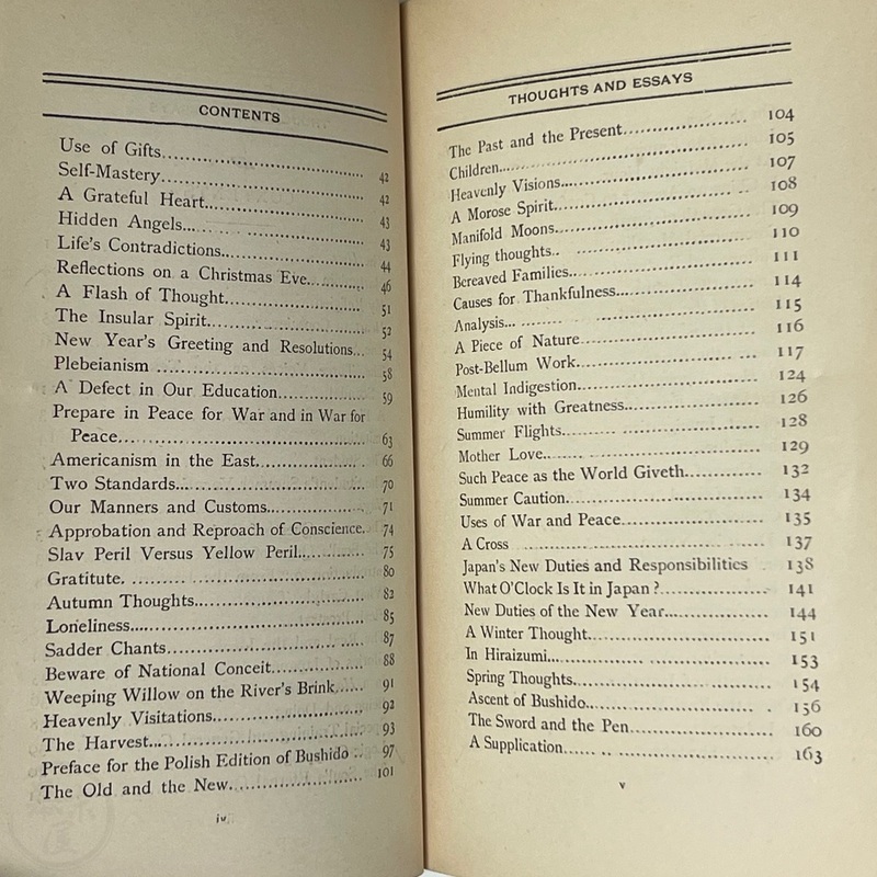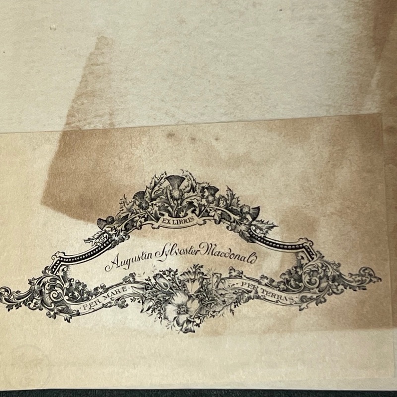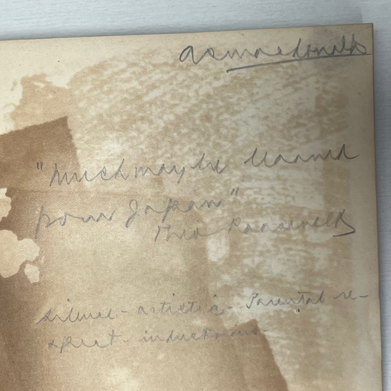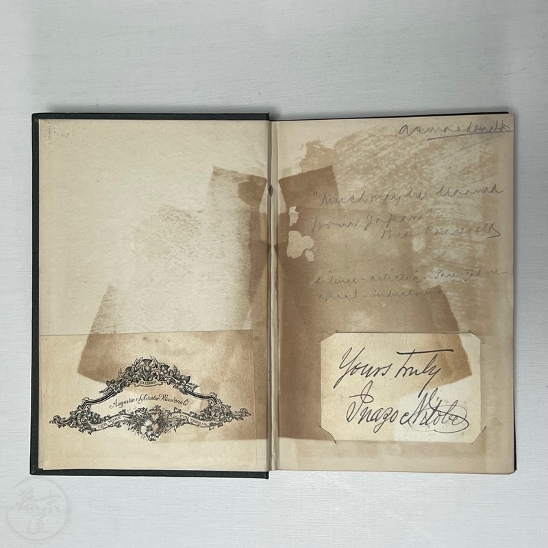 オーギュスティン・シルヴェスター・マクドナルド(1865-1959)の蔵書で、彼の蔵書印と手書きの名前、マクドナルドによるものと思われる鉛筆書きのメモ(セオドア・ルーズベルトの「日本から多くを学ぶことができる」という言葉を引用したもの)がある。表表紙の見返しには4つの小さな切れ込みがあり、「Yours truly, Inazo Nitobe」と署名された小さなカードが挟み込まれている。おそらく、マクドナルドはどこかで新渡戸氏に会ったのだろう。1927年2月付の小さな新聞の切り抜きもタイトルページに挟まっており、新渡戸氏が「平和顧問」としてまもなくサンフランシスコに到着することが書かれている。