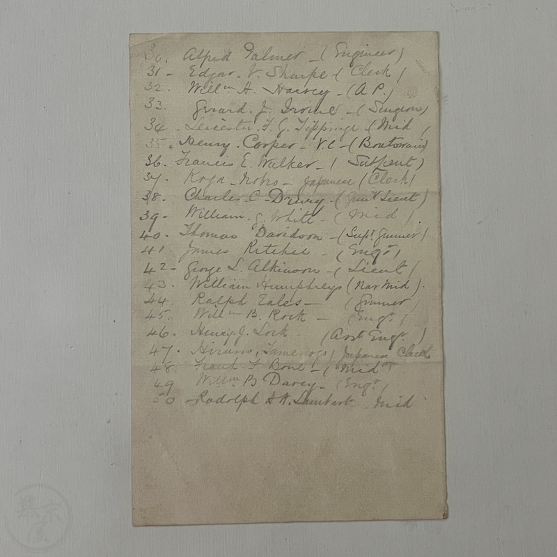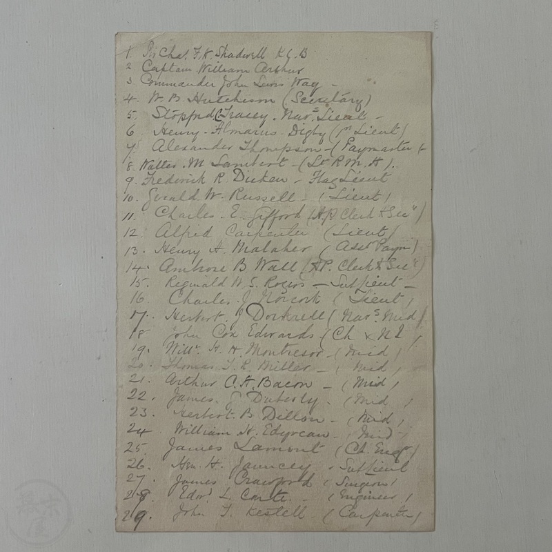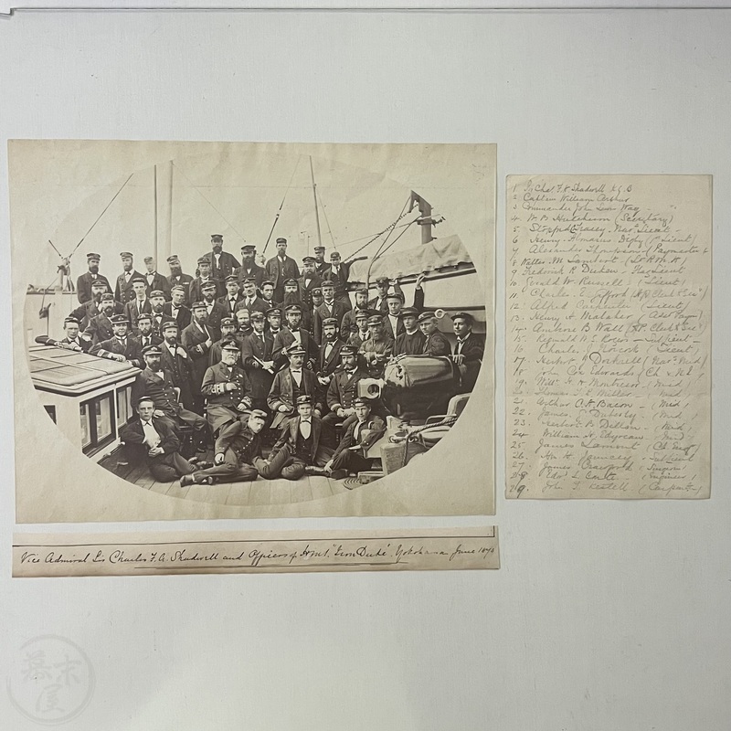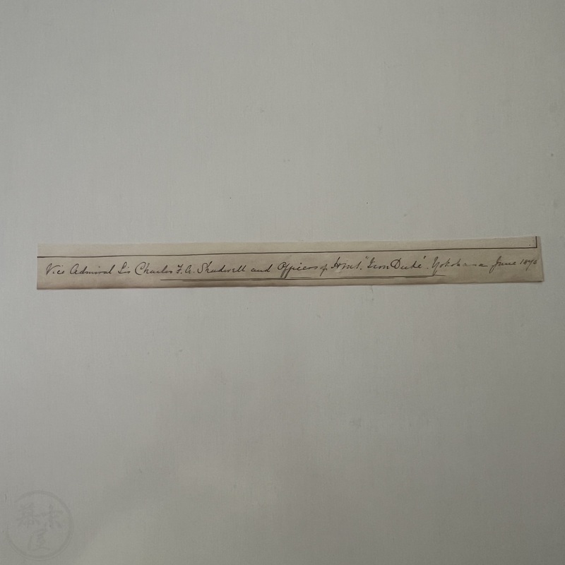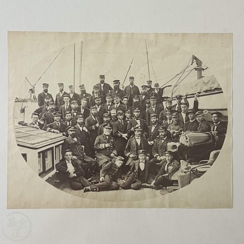 良好。経年の傷み、しわ少々あり。台紙に貼っていない。キャプションは「Vice Admiral Sir Charles F.G. Shadwell and Officers of HMS "Iron Duke". Yokohama, June 1873」が書いてある。