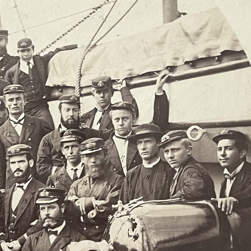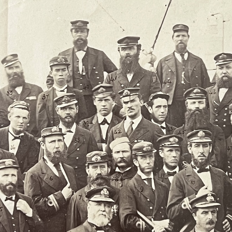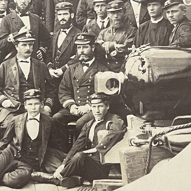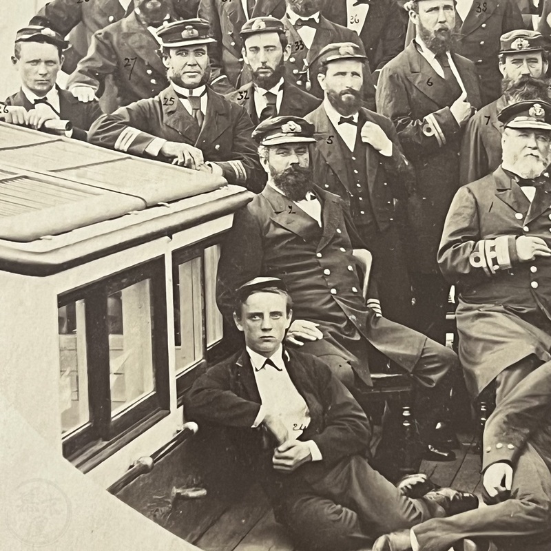 フェリックス・ベアト撮影とされる重要な写真。HMSアイアン・デュークの将校と乗組員を写す。同艦隊は1871年から1875年、さらに1878年から1883年にかけて日本を含む地域に展開した。HMSアイアン・デュークは1873年5月16日から7月7日まで横浜港に停泊しており、寄港中に6月に撮影されたものである。興味深いことに、乗船している日本人船員のうち2名(Koga Nobuo氏とHirano Tamenojo氏)が「事務員」と記載されている。