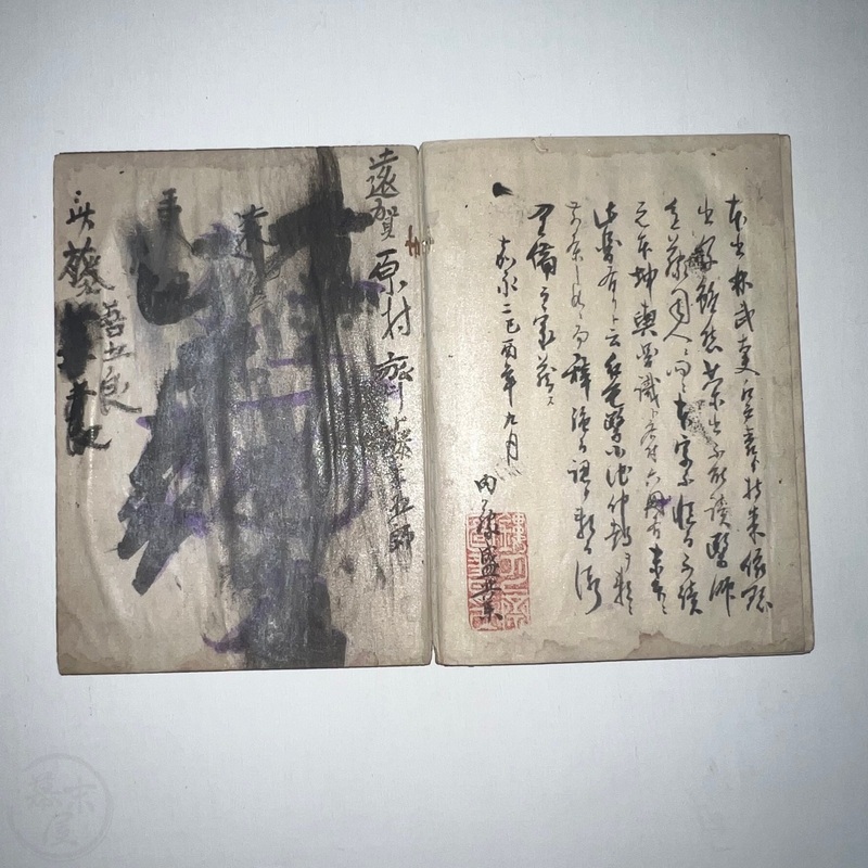 並から良好。木材表紙と裏表紙に傷み少々あり。落書きあり。虫損少々あり。中はほぼ良好。