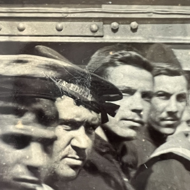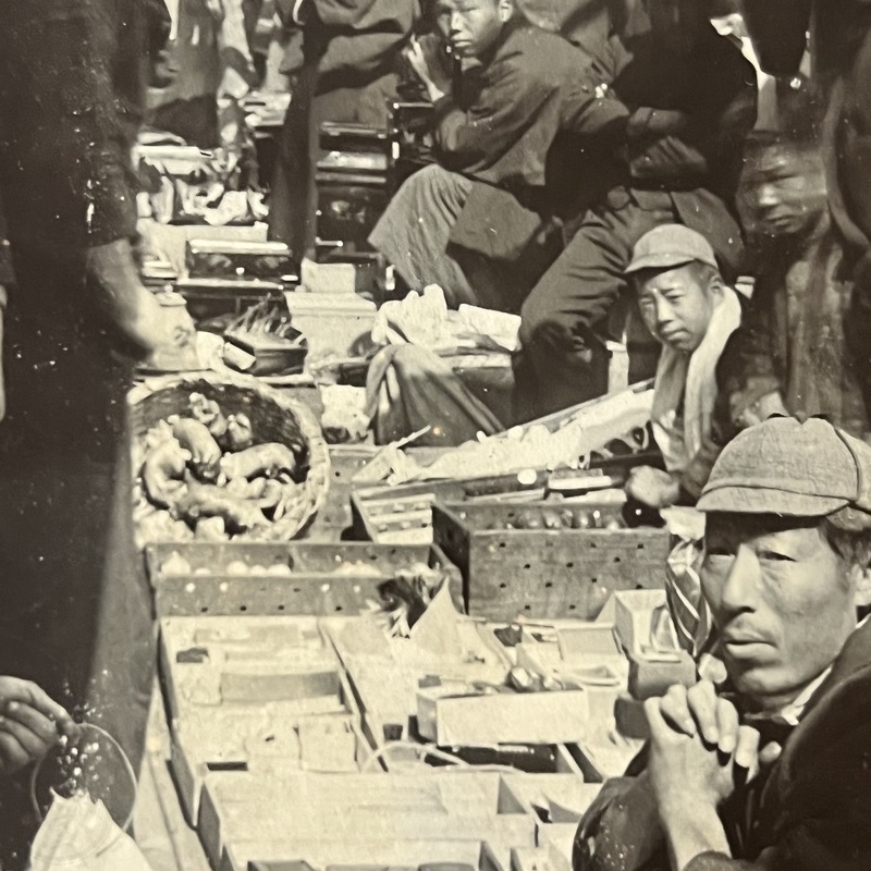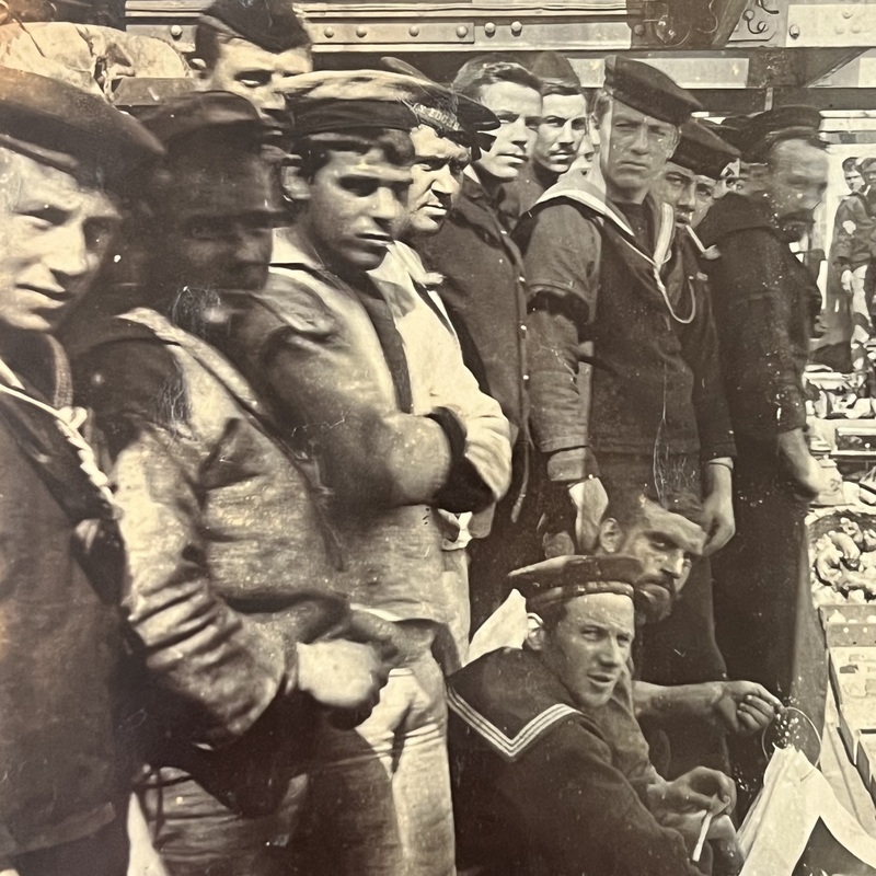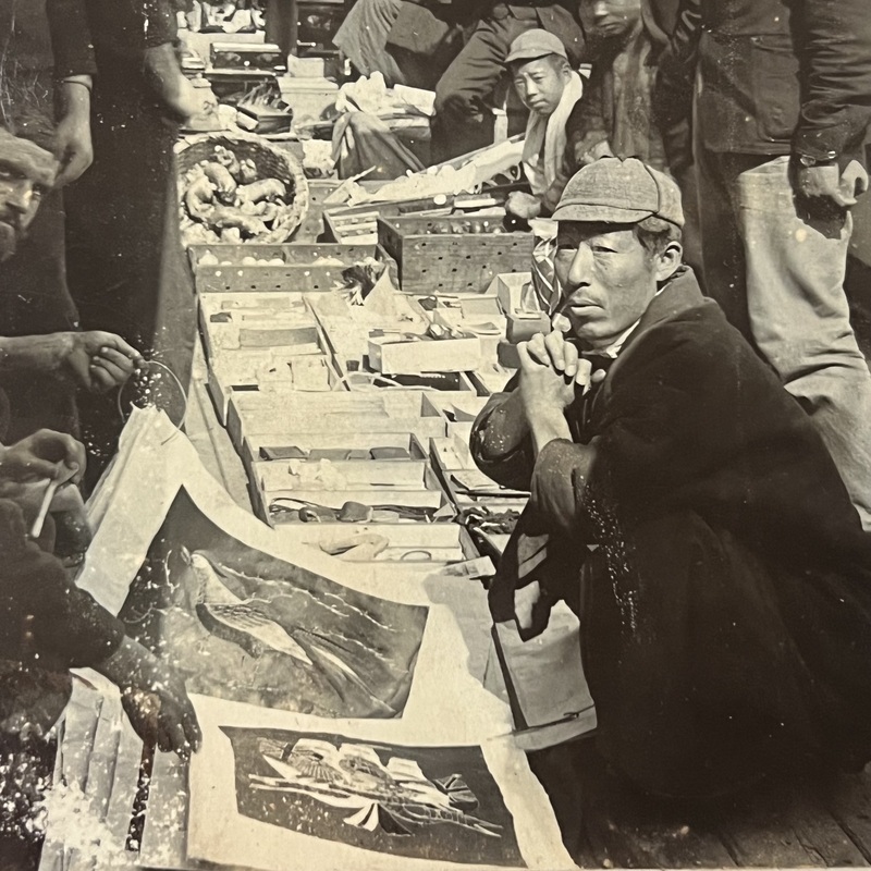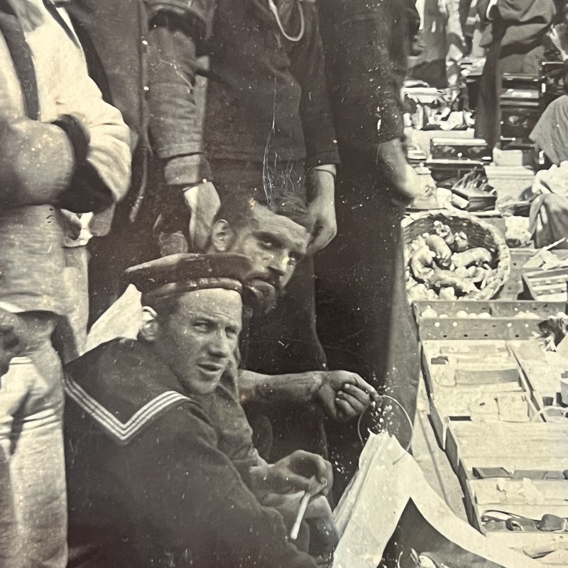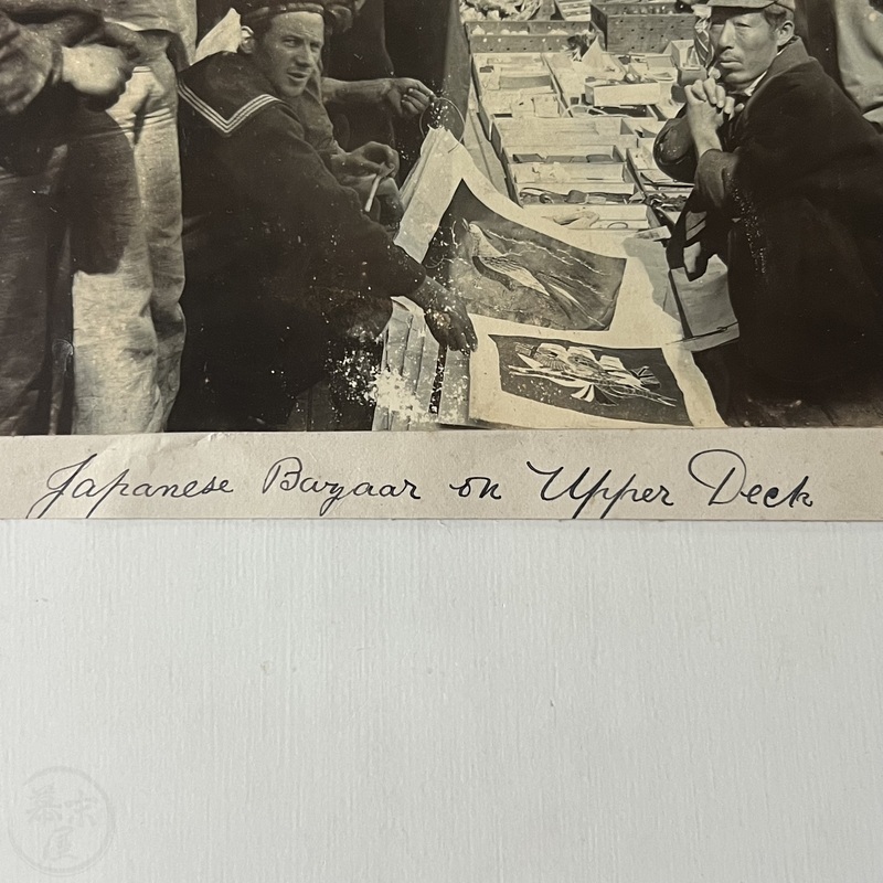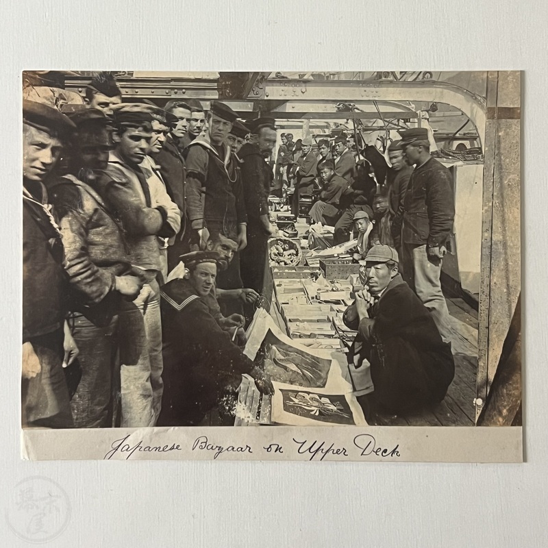 日本人達がHMSエドガー号の乗組員に版画や骨董品などの品々を売り歩く。水兵の帽子の一つには「HMS EDGAR」と記されている。同艦は1895年頃、そして1900年頃から再び中国駐留艦隊(日本を含む)に配属された。おそらく横浜に停泊中、乗組員が撮影したものと推測される。このような写真は初めて目にするものである。台紙に「Japanese Bazaar on Upper Deck」が書いてある。