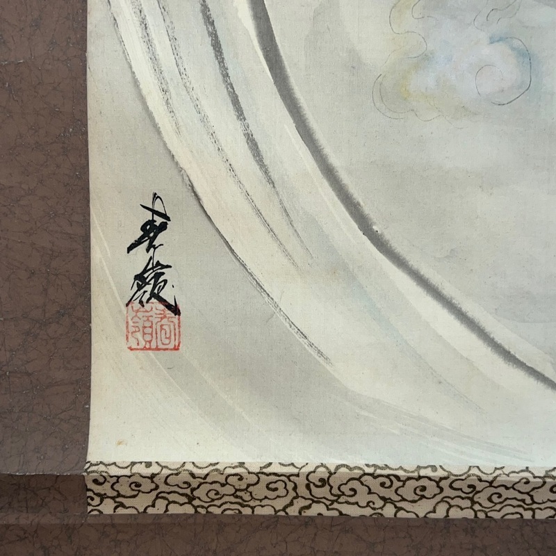 [Japan] Hand drawn, painted illustration of a sinister-looking female ghost or yurei under a crescent moon. The red artist seal reads Shunrei which may be Otsuka Shunrei but we have been unable to find any other yurei works by that artist. An impressive work by a skilled artist.