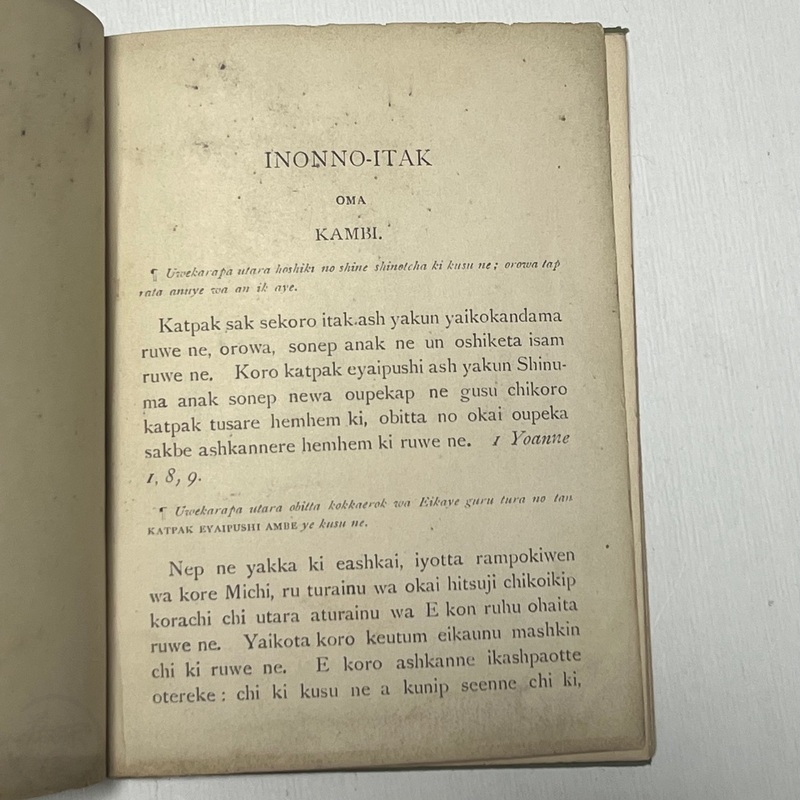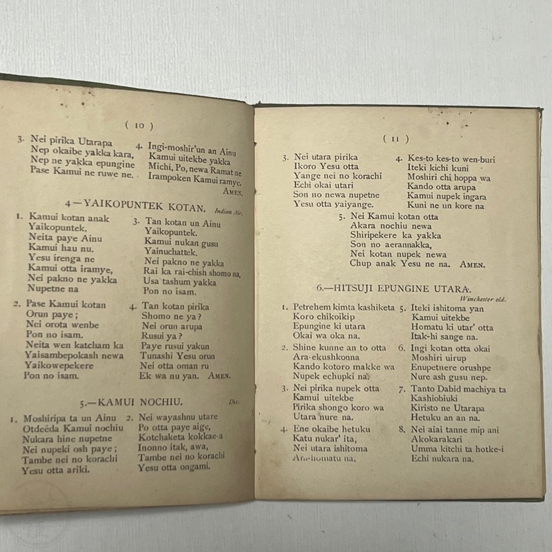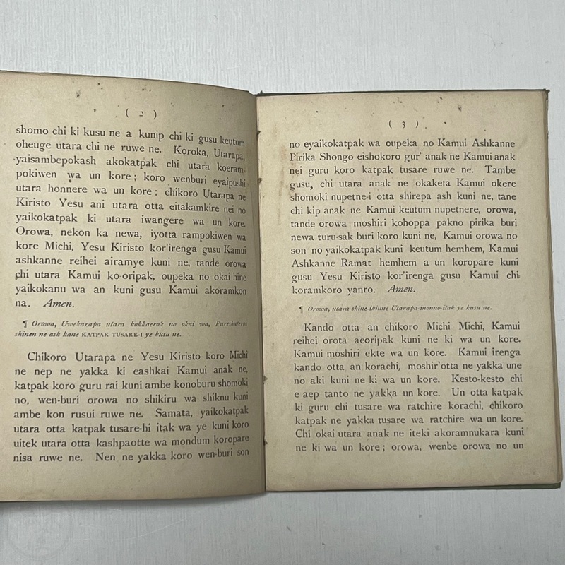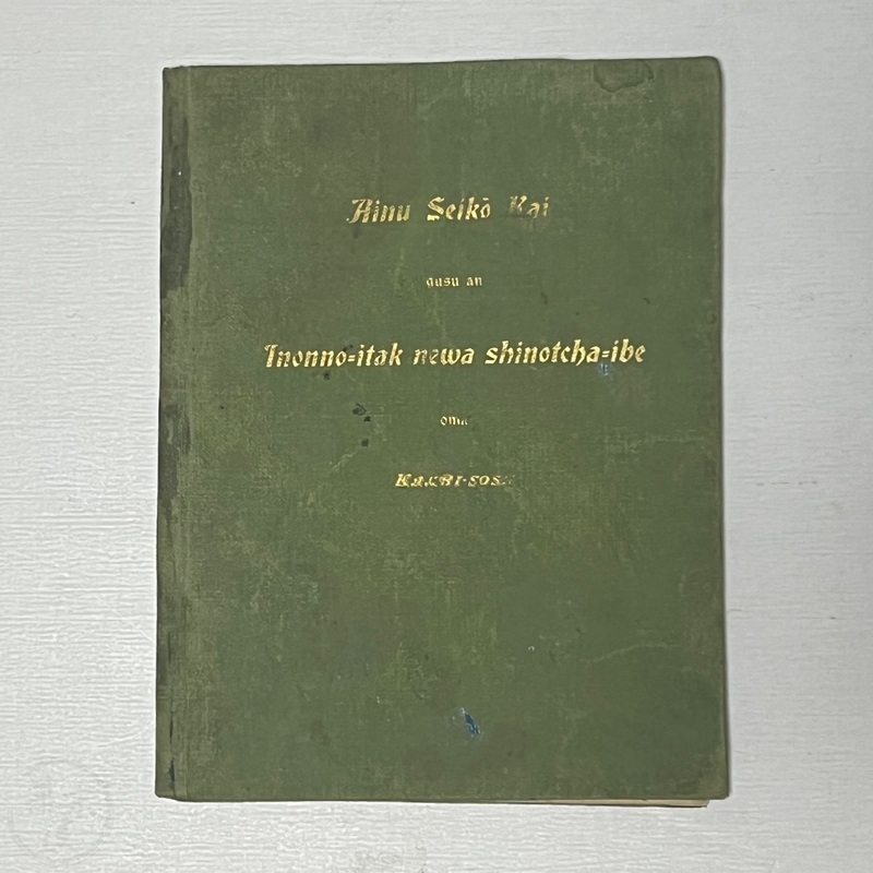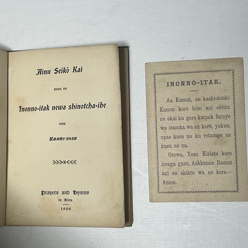 日本では北海道大学に1冊のみ所蔵され、国外には一切存在しないため、極めて稀覯な本である。一部の文献ではジョン・バッチェラー牧師(1855-1944)によるアイヌ語訳と記されているが、本書にはその名が記載されていないもの。小さな別刷りの葉書が挿入されていて、おそらく主の祈りをアイヌ語で記したと思われる。