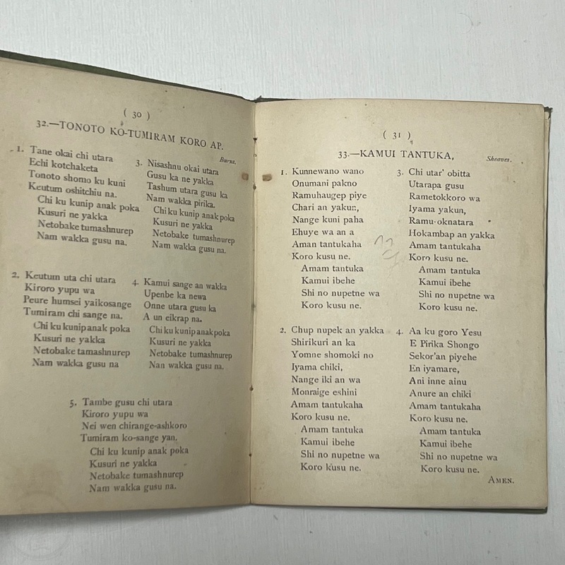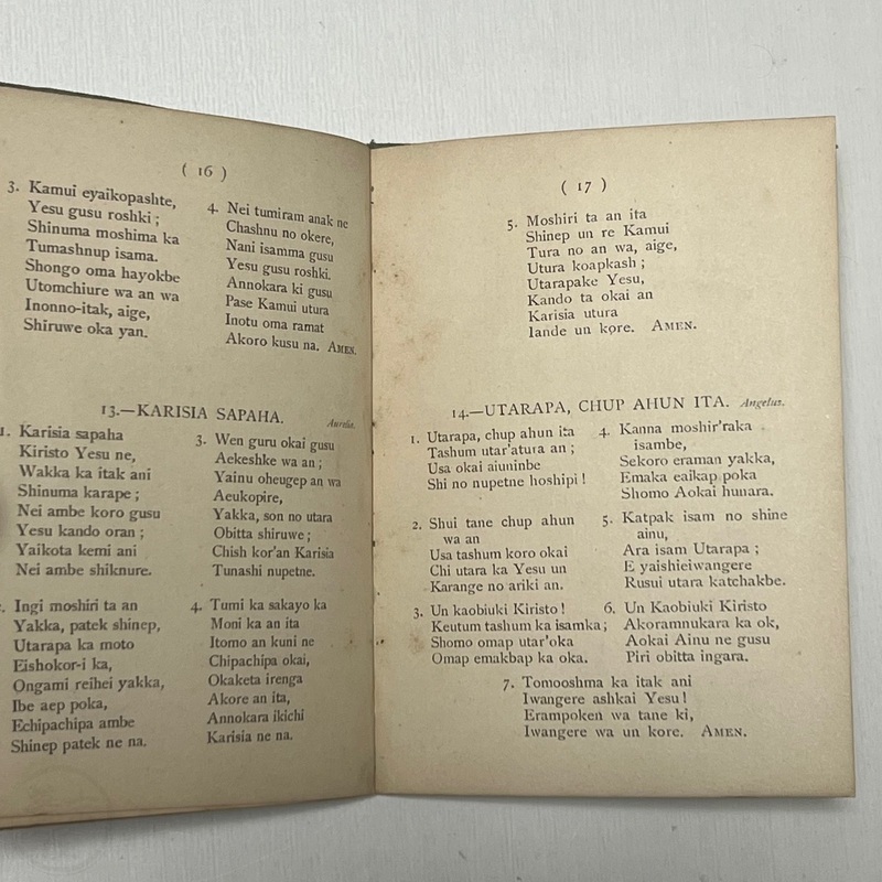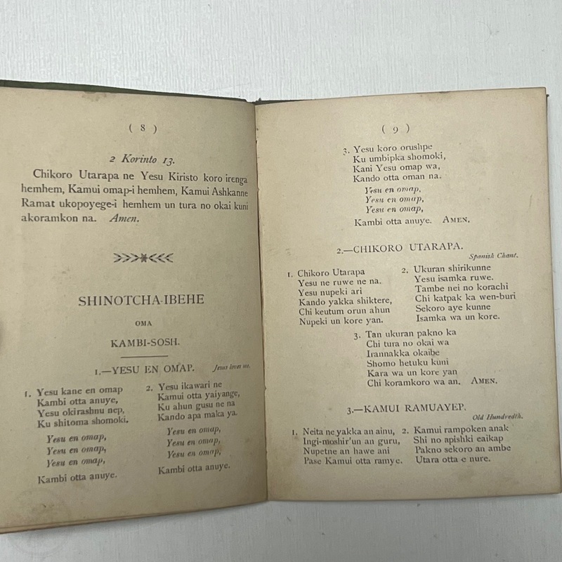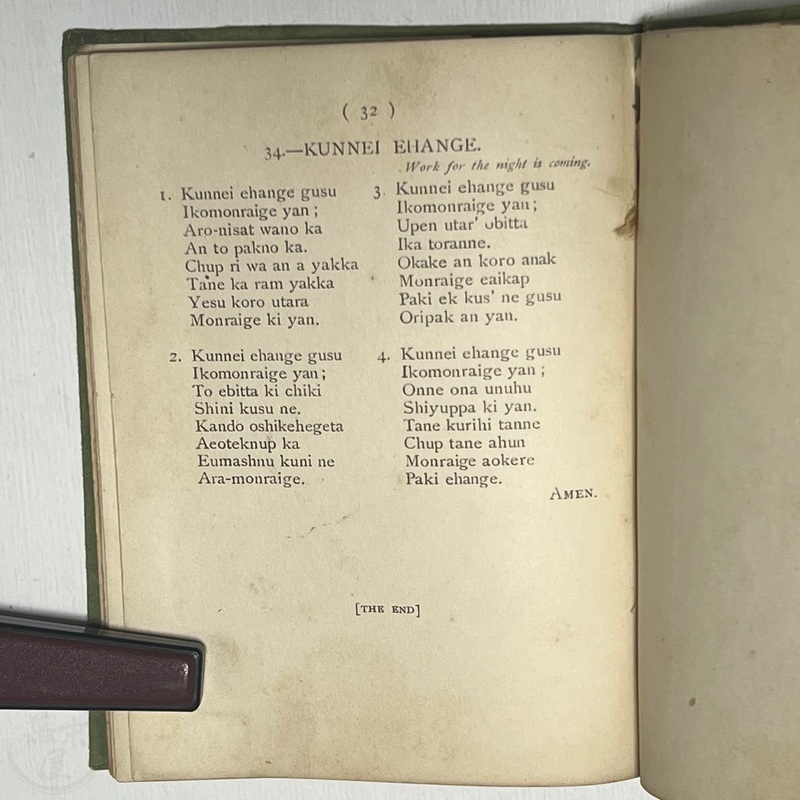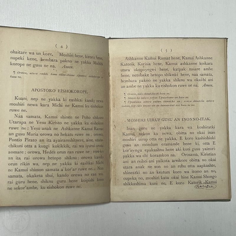 日本では北海道大学に1冊のみ所蔵され、国外には一切存在しないため、極めて稀覯な本である。一部の文献ではジョン・バッチェラー牧師(1855-1944)によるアイヌ語訳と記されているが、本書にはその名が記載されていないもの。小さな別刷りの葉書が挿入されていて、おそらく主の祈りをアイヌ語で記したと思われる。