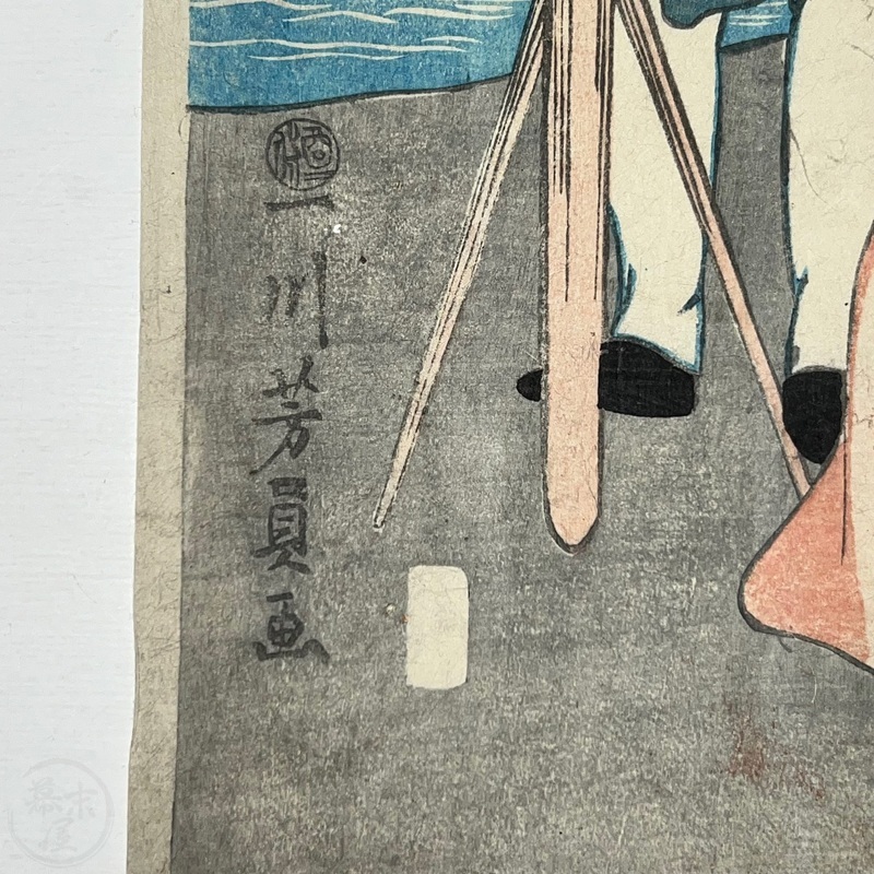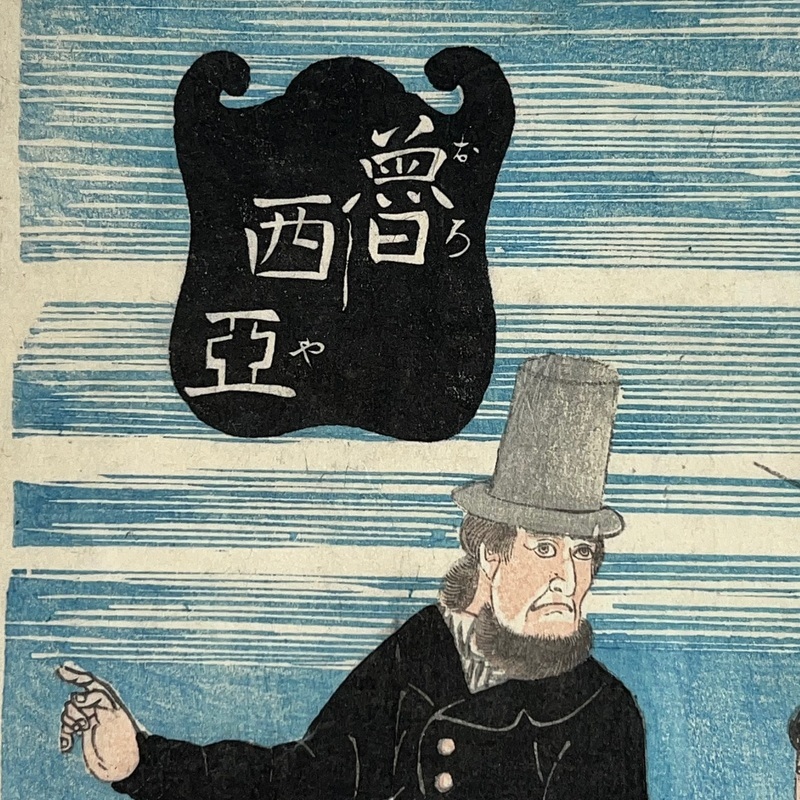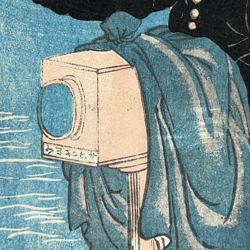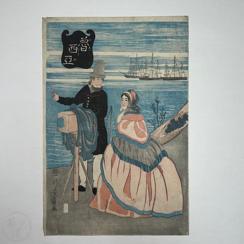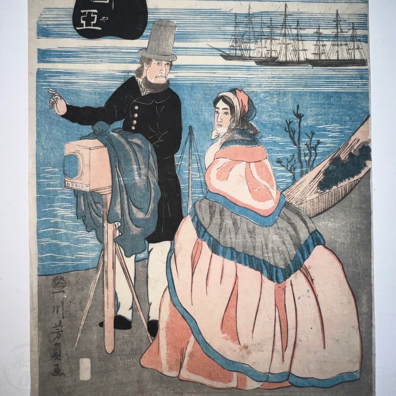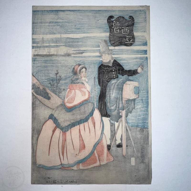 [Japan] Not found in the main reference book of Yokohama prints, 'Shitaisei Yokohama Ukiyoe' (Yurindo, 1979), this interesting work shows a Russian couple with a camera. This leads to the question of who the photographer was and there can only be very few candidates as the print was published in February 1861 when there were very few Westerners living in Japan. The camera has what appears to be the word 'Sasinkyo' [Shashinkyo? i.e. 'camera'] written on it.