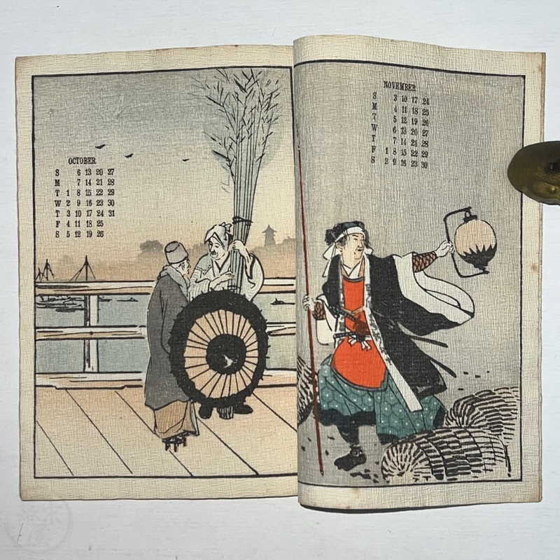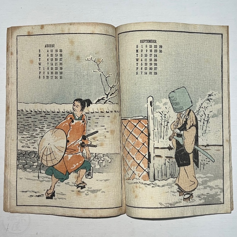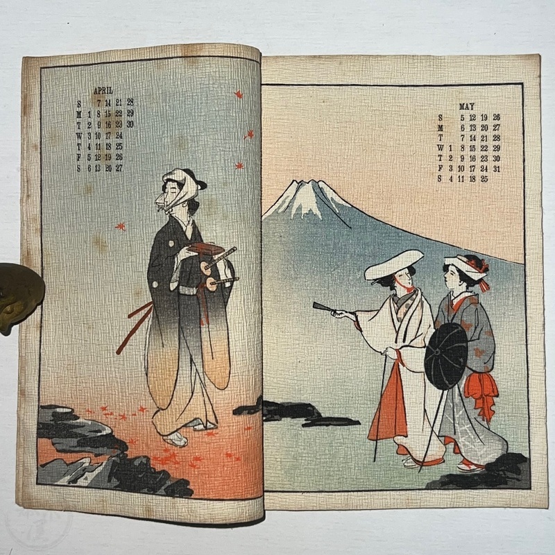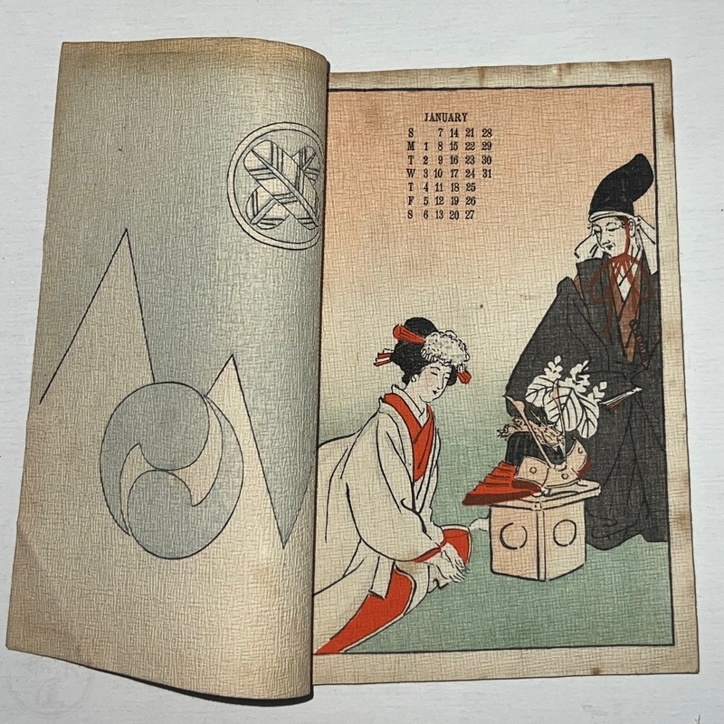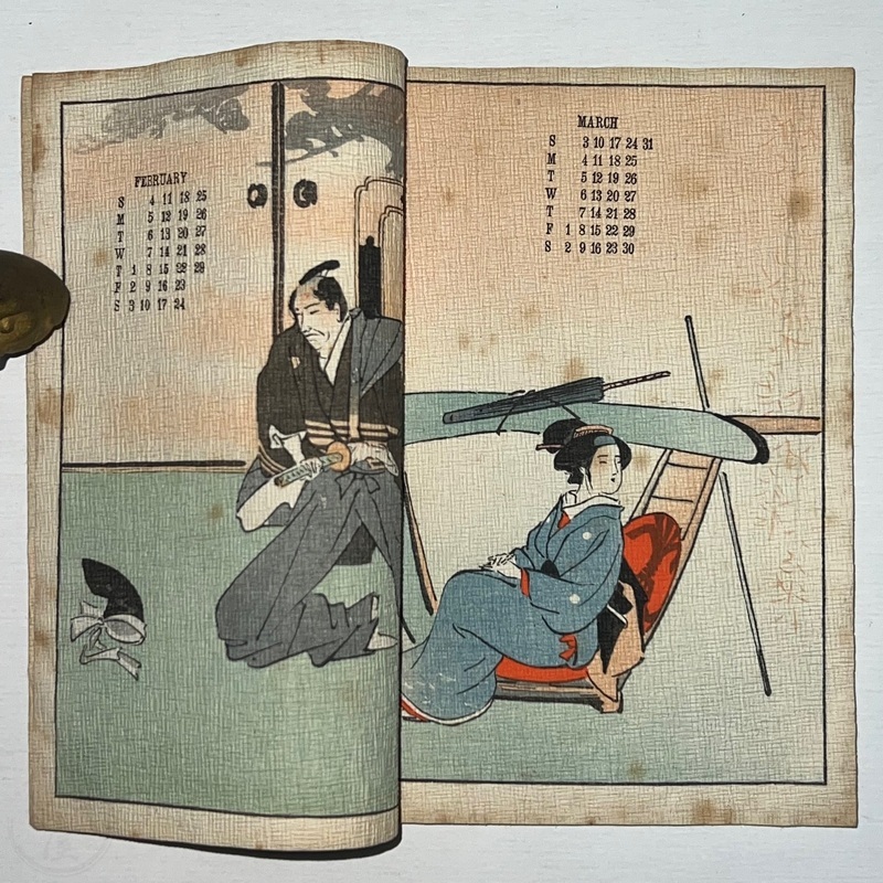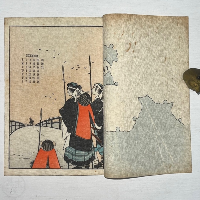 [Japan] The first time we have seen this particular crepe paper calendar that was not published by Hasegawa. The illustraitons are very good and the 'i' character at the end indicates it may have been published by Isetatsu. Probably 1911.