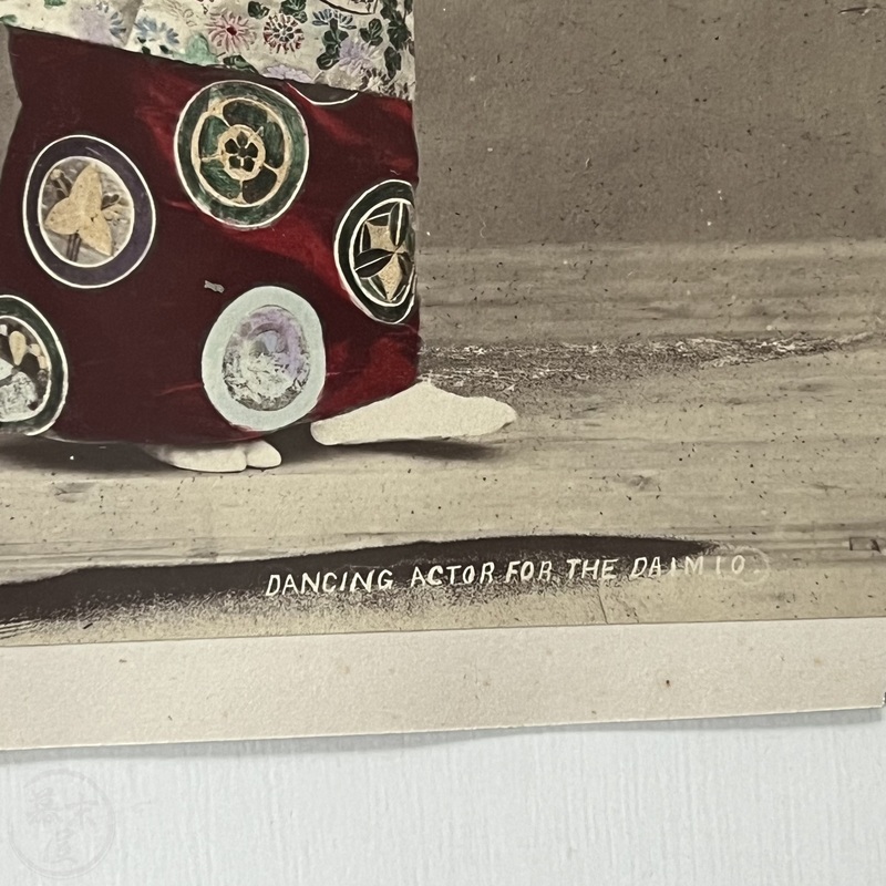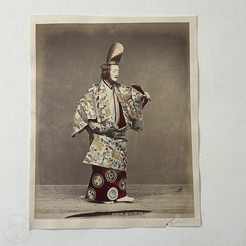 [Japan] Nicely hand-coloured albumen photo of a dancer in traditional Japanese court attire. Titled, 'DANCING ACTOR FOR THE DAIMIO 325' at bottom in negative. c1885.