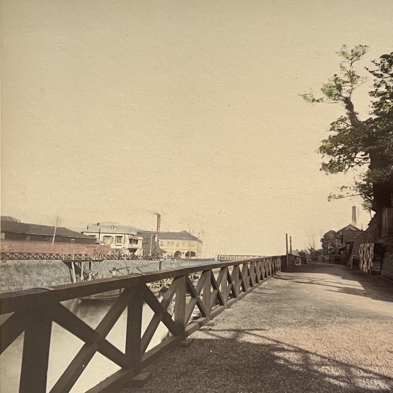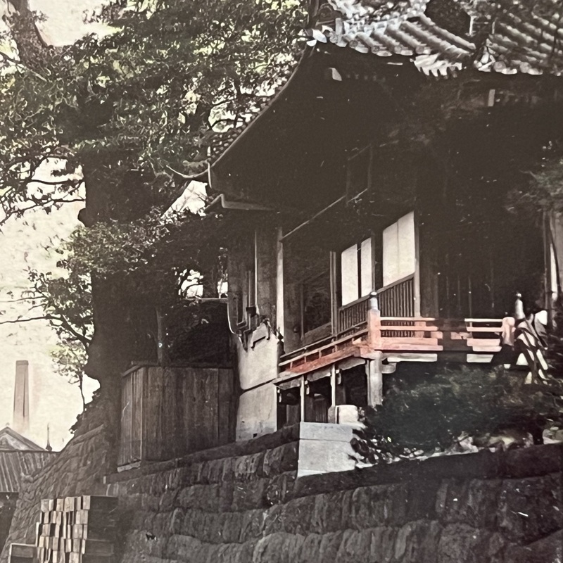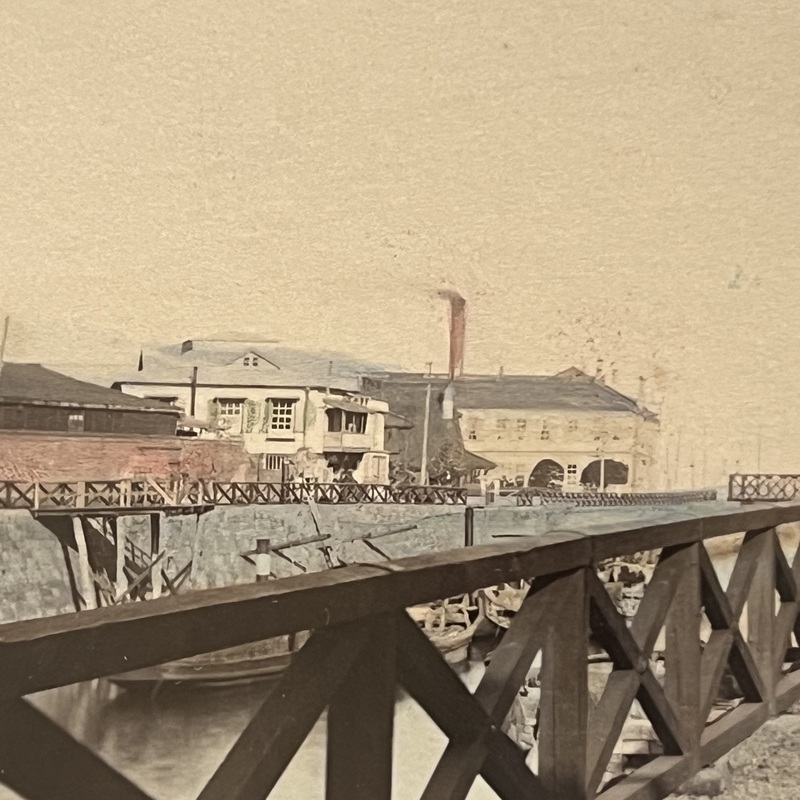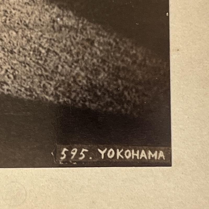 [Japan] A view of part of Yokohama that we have never seen before. At right is a temple and across the creek we see some large buildings and presumably the Grand Hotel behind them off to the left. Titled, '595 YOKOHAMA' this looks to be a photo by Kusakabe Kimbei.