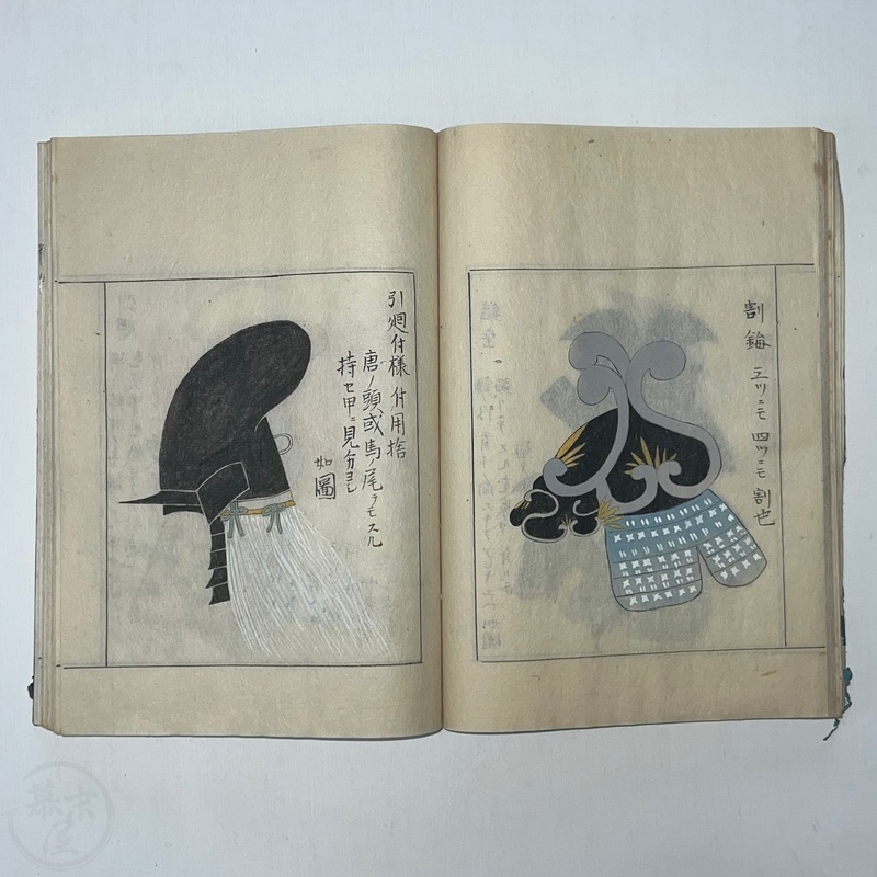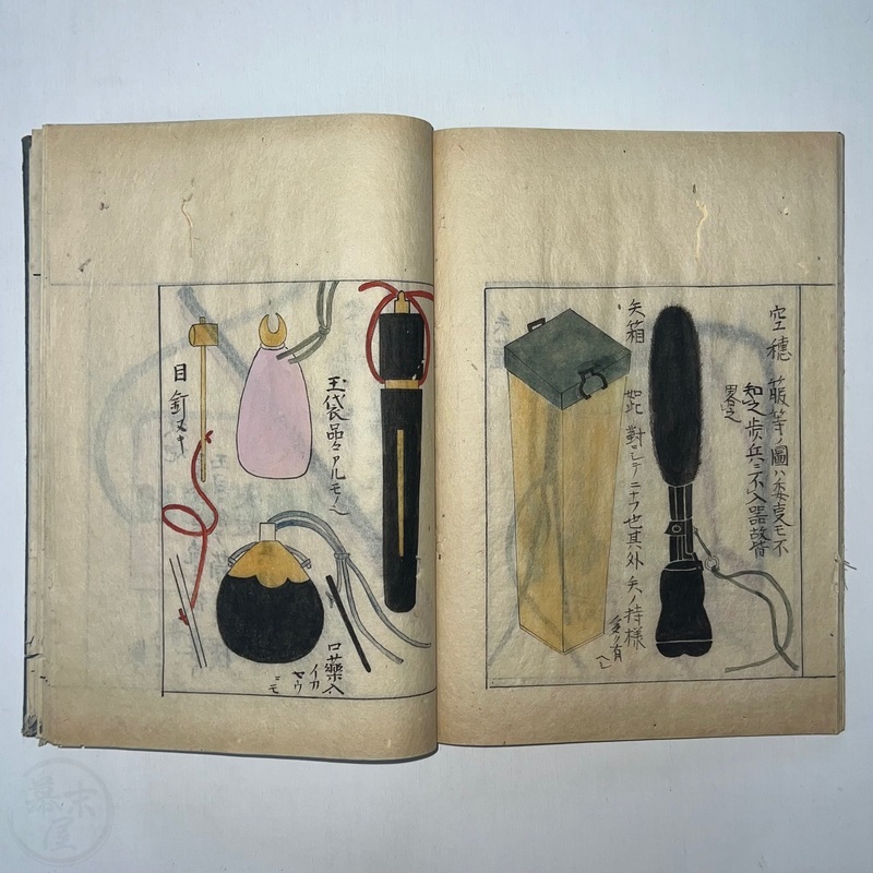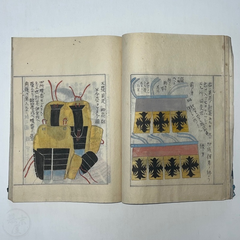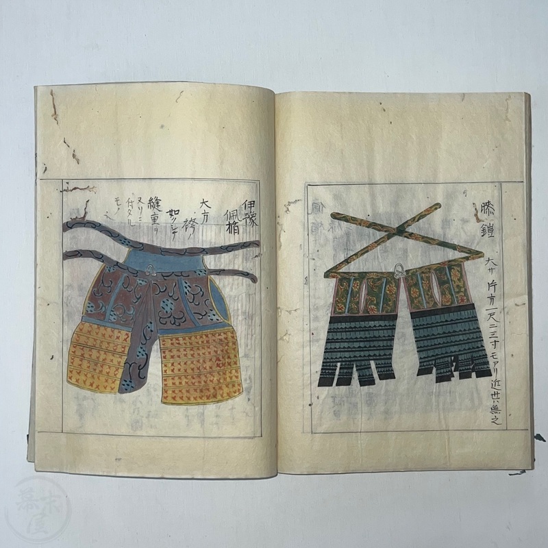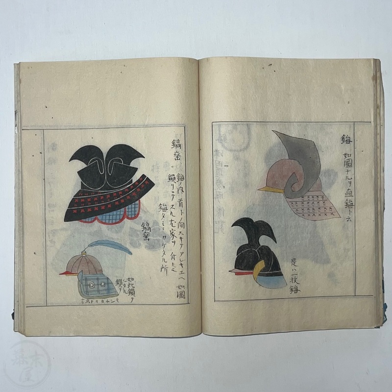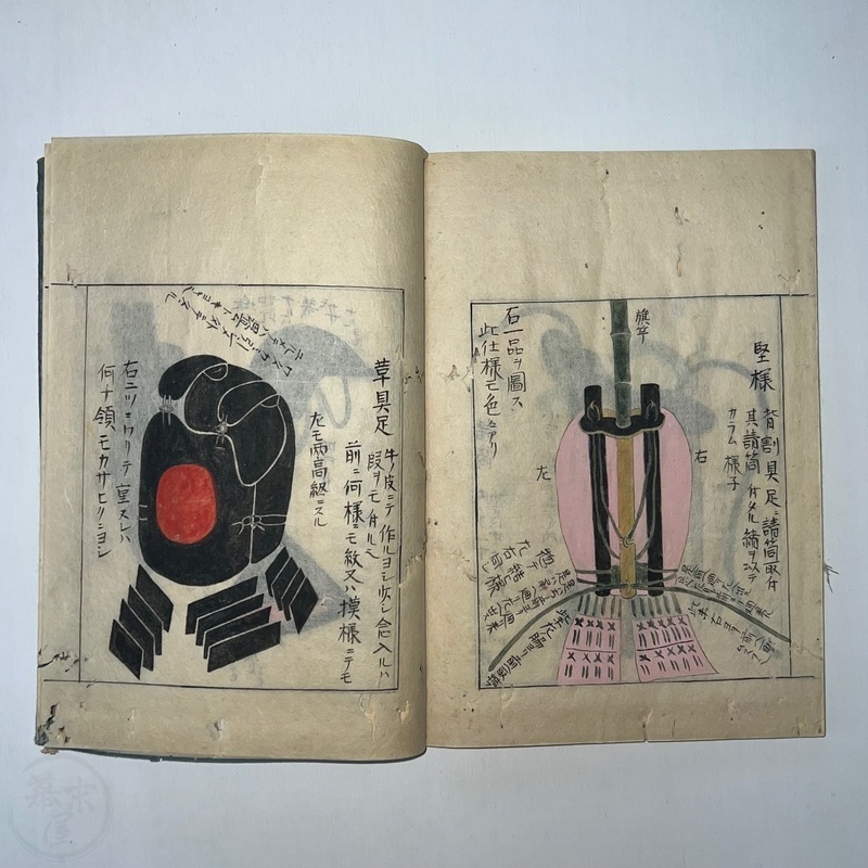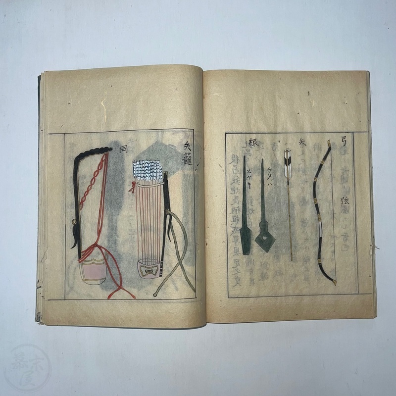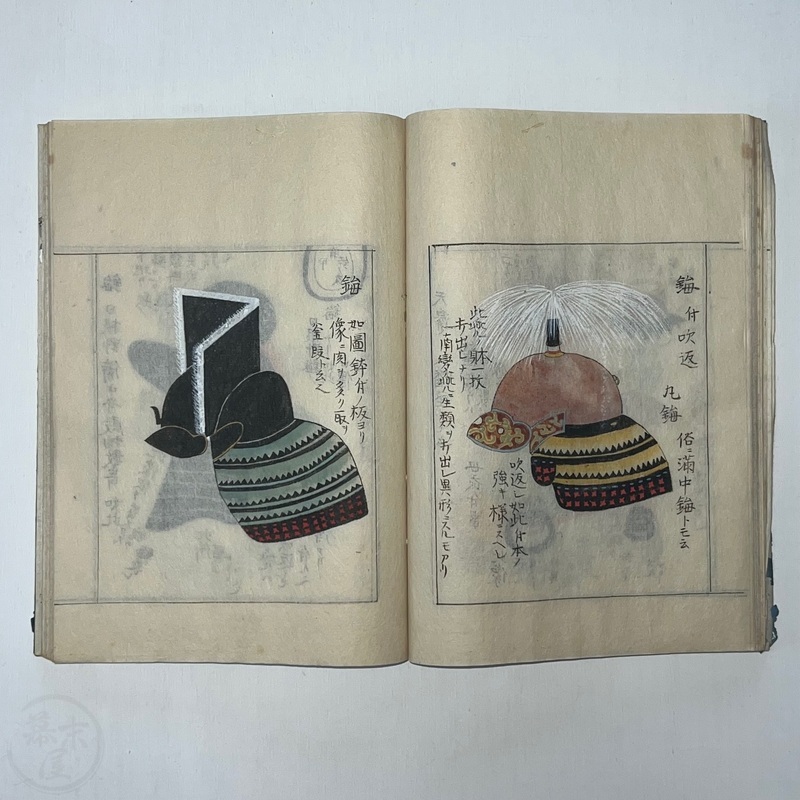 [Japan] Two volume set of this superb 'Illustrated Guide to Military Equipment' (Title in Japanese: 'Heikinomaki Zukai') written by Arisawa Takesada in 1708. Each volume is dated at the rear Hoei 5 (1708) though these two books are probably from the mid to late 1700s. The illustrations are high quality, nicely coloured and detailed. Arisawa (1682-1739) was a military scholar from Kanazawa during the early to mid-Edo period. Following the end of a period of intense civil strife when there was a sustained peace in Japan, he is thought to have undertaken research into the armour and weapons once employed in battle.