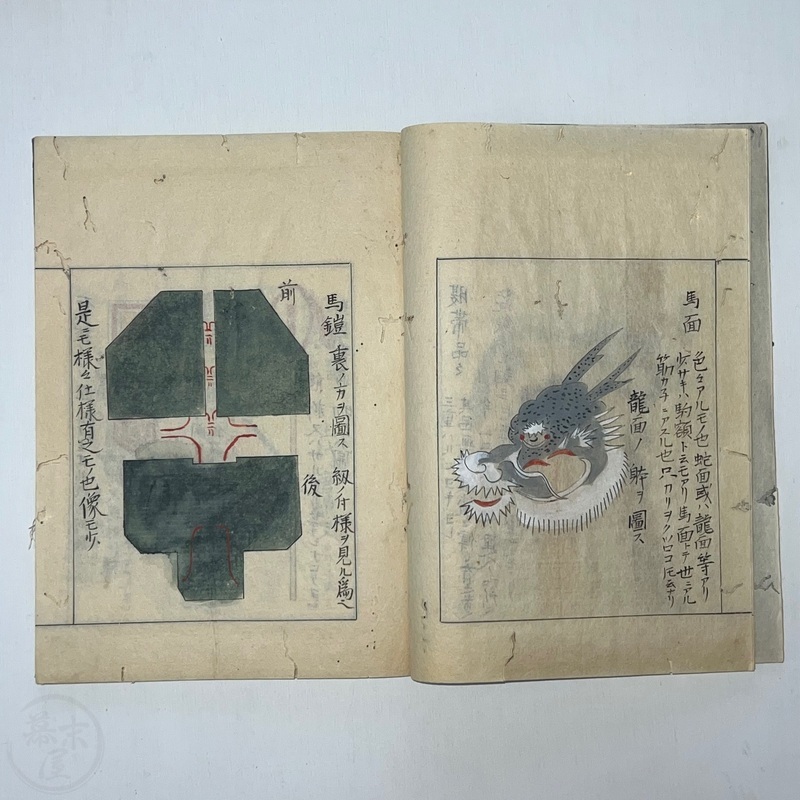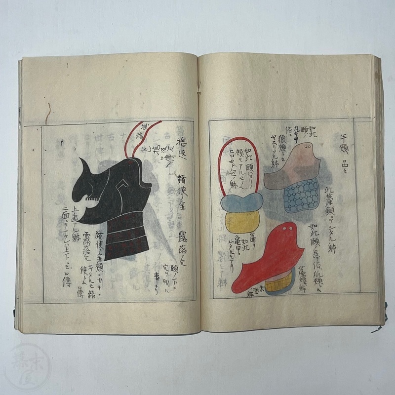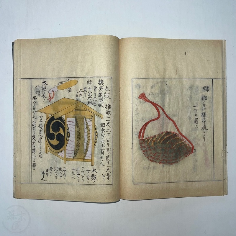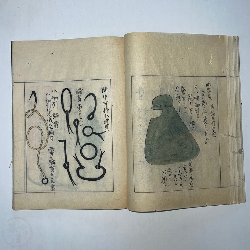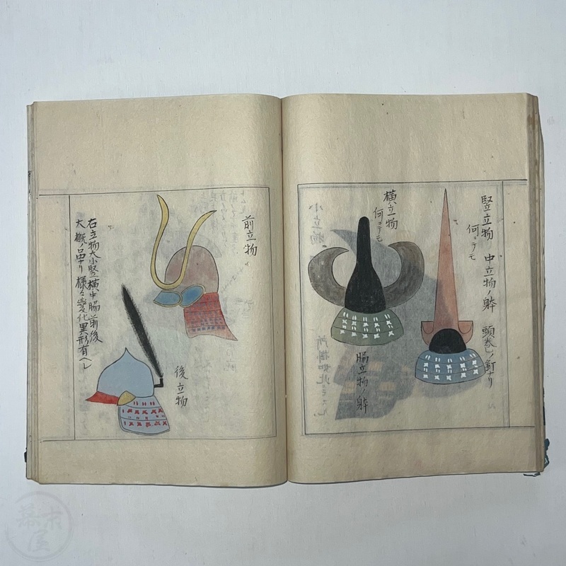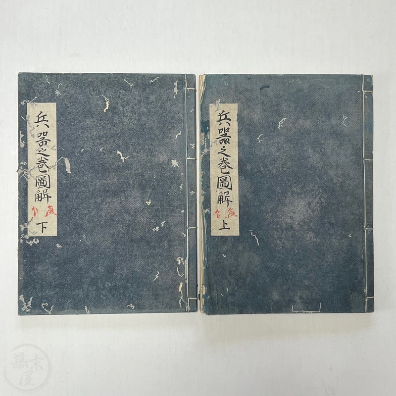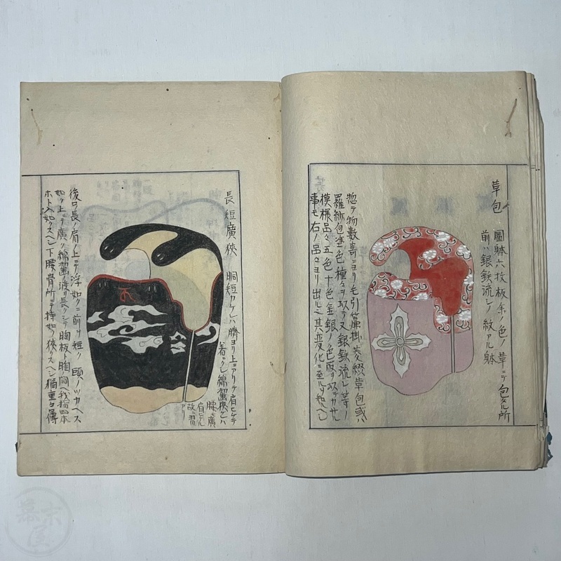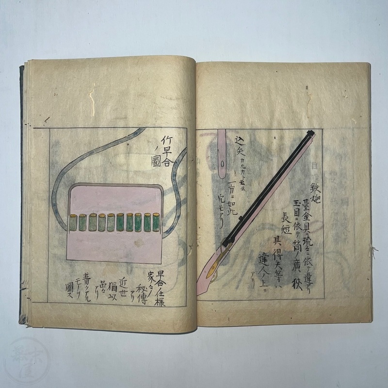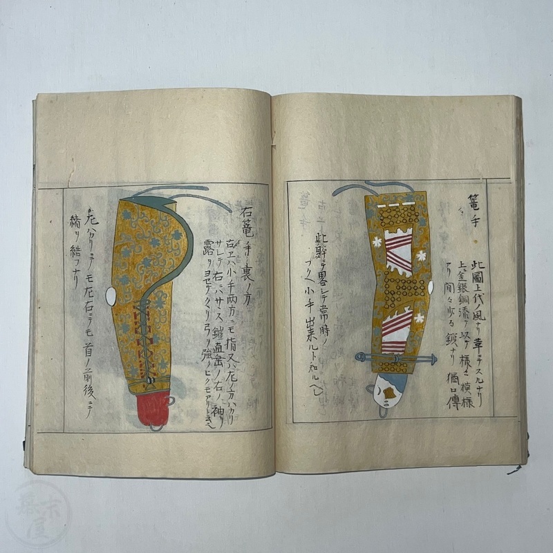 [Japan] Two volume set of this superb 'Illustrated Guide to Military Equipment' (Title in Japanese: 'Heikinomaki Zukai') written by Arisawa Takesada in 1708. Each volume is dated at the rear Hoei 5 (1708) though these two books are probably from the mid to late 1700s. The illustrations are high quality, nicely coloured and detailed. Arisawa (1682-1739) was a military scholar from Kanazawa during the early to mid-Edo period. Following the end of a period of intense civil strife when there was a sustained peace in Japan, he is thought to have undertaken research into the armour and weapons once employed in battle.