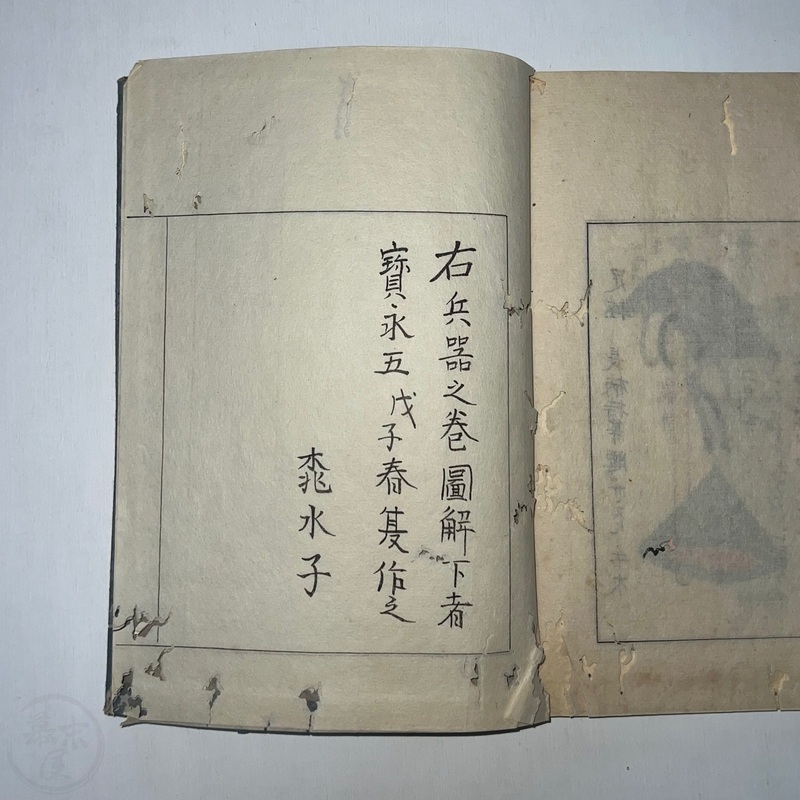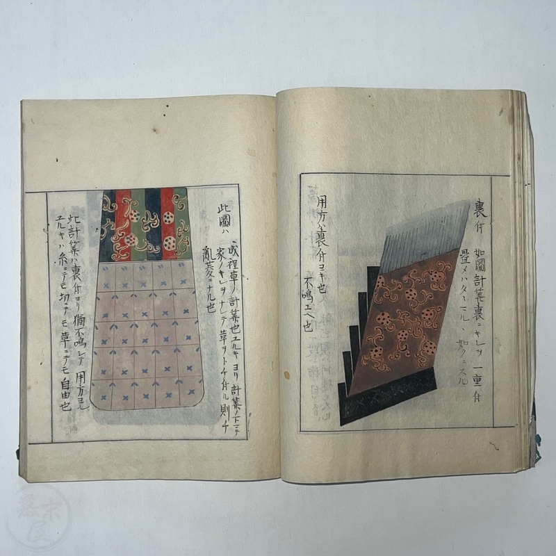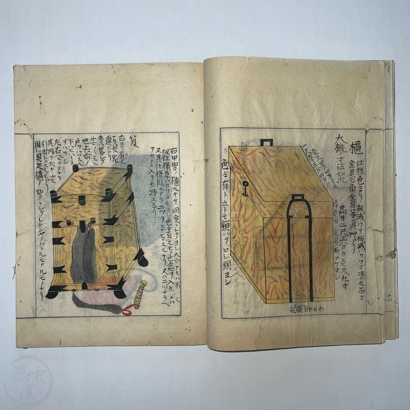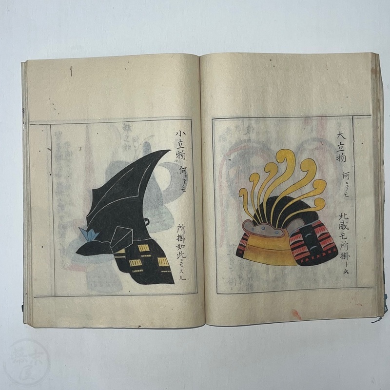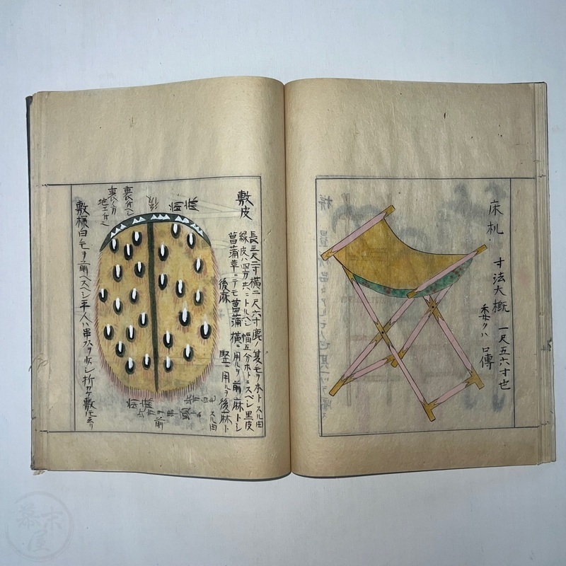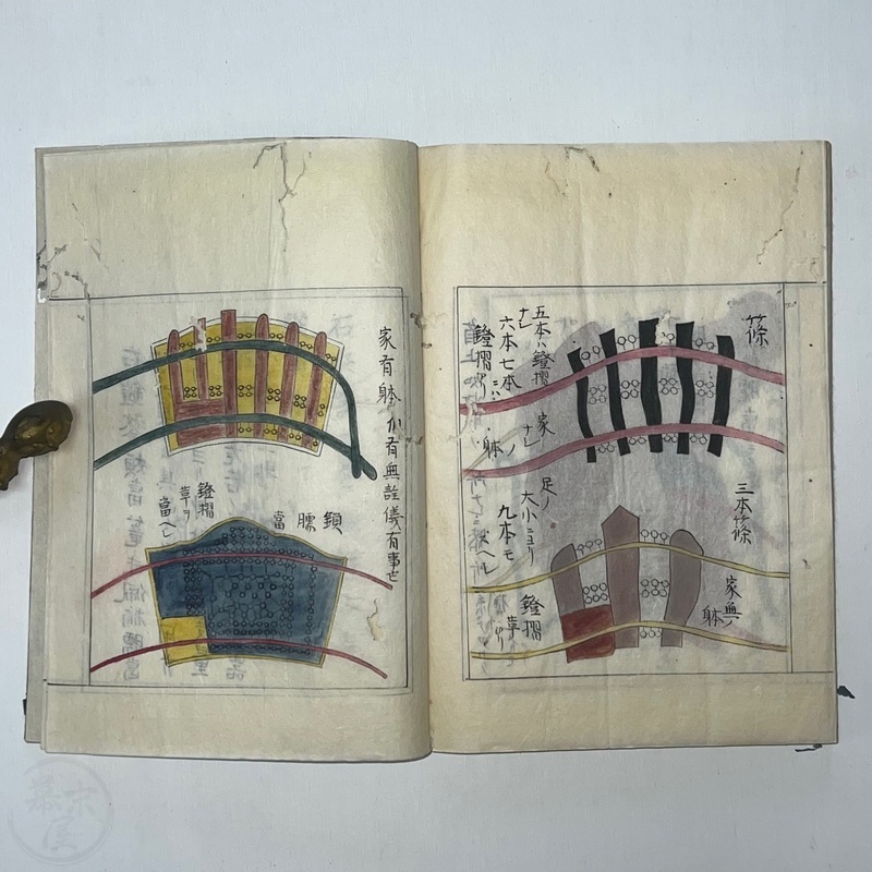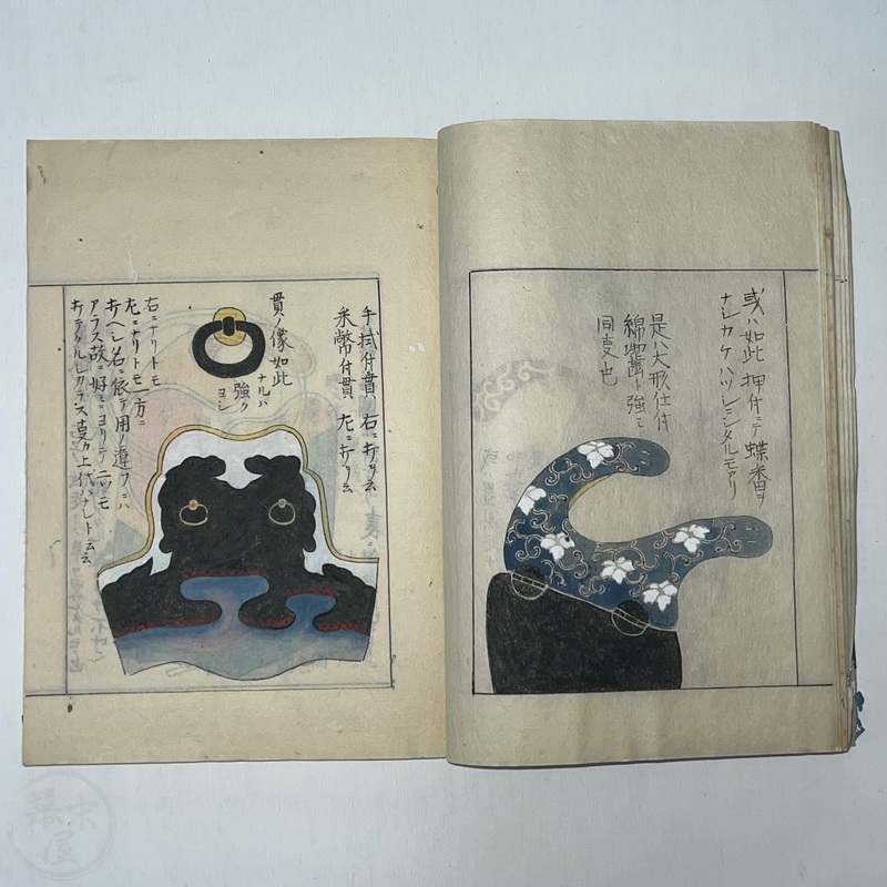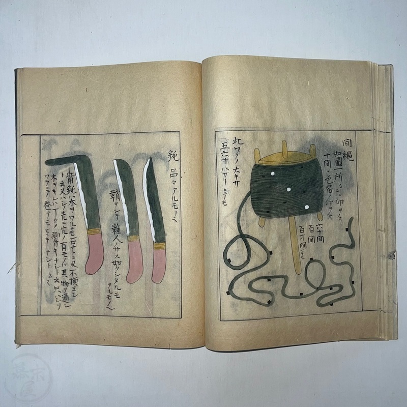 [Japan] Two volume set of this superb 'Illustrated Guide to Military Equipment' (Title in Japanese: 'Heikinomaki Zukai') written by Arisawa Takesada in 1708. Each volume is dated at the rear Hoei 5 (1708) though these two books are probably from the mid to late 1700s. The illustrations are high quality, nicely coloured and detailed. Arisawa (1682-1739) was a military scholar from Kanazawa during the early to mid-Edo period. Following the end of a period of intense civil strife when there was a sustained peace in Japan, he is thought to have undertaken research into the armour and weapons once employed in battle.